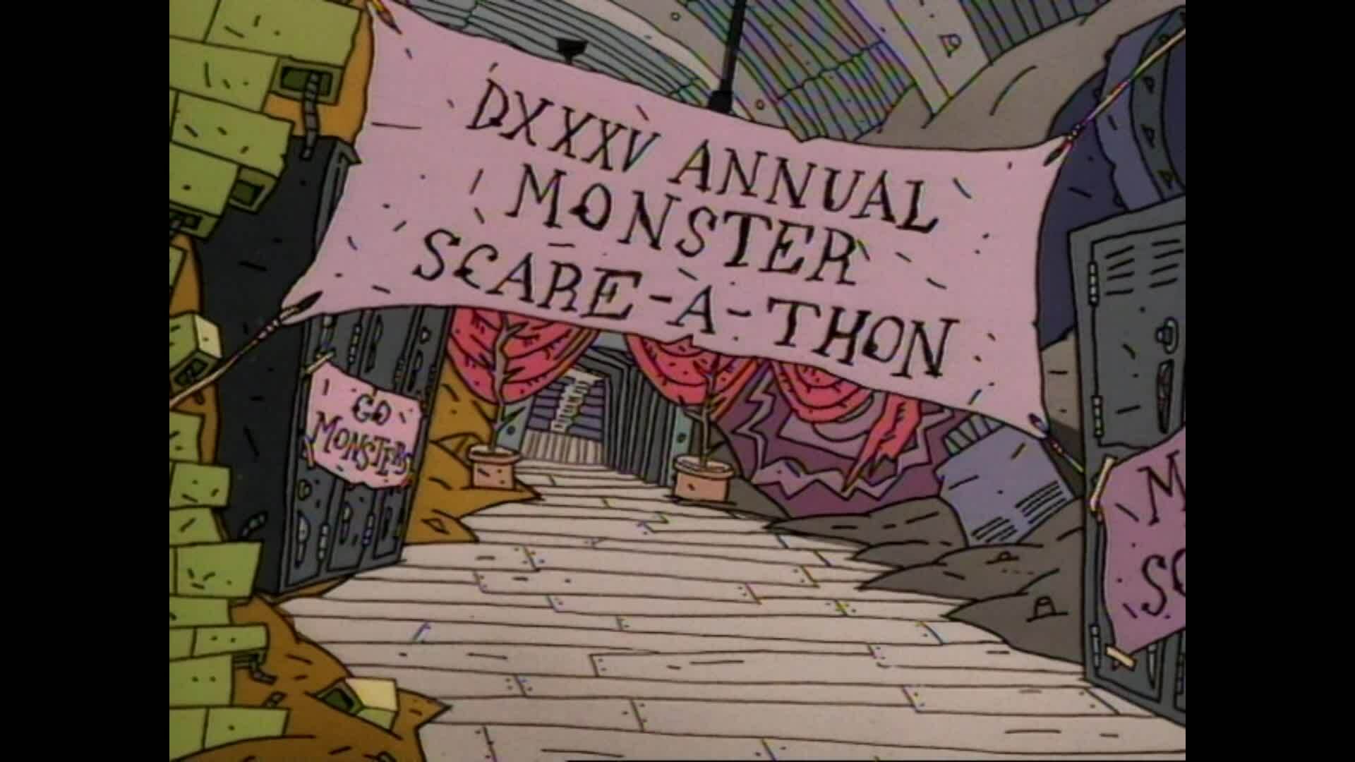 Gromble pendura um enorme relógio no pescoço de Ickis. / Gromble fica doente e Simpah, o horrível monstro da cafeteria, deve tomar conta dos alunos.