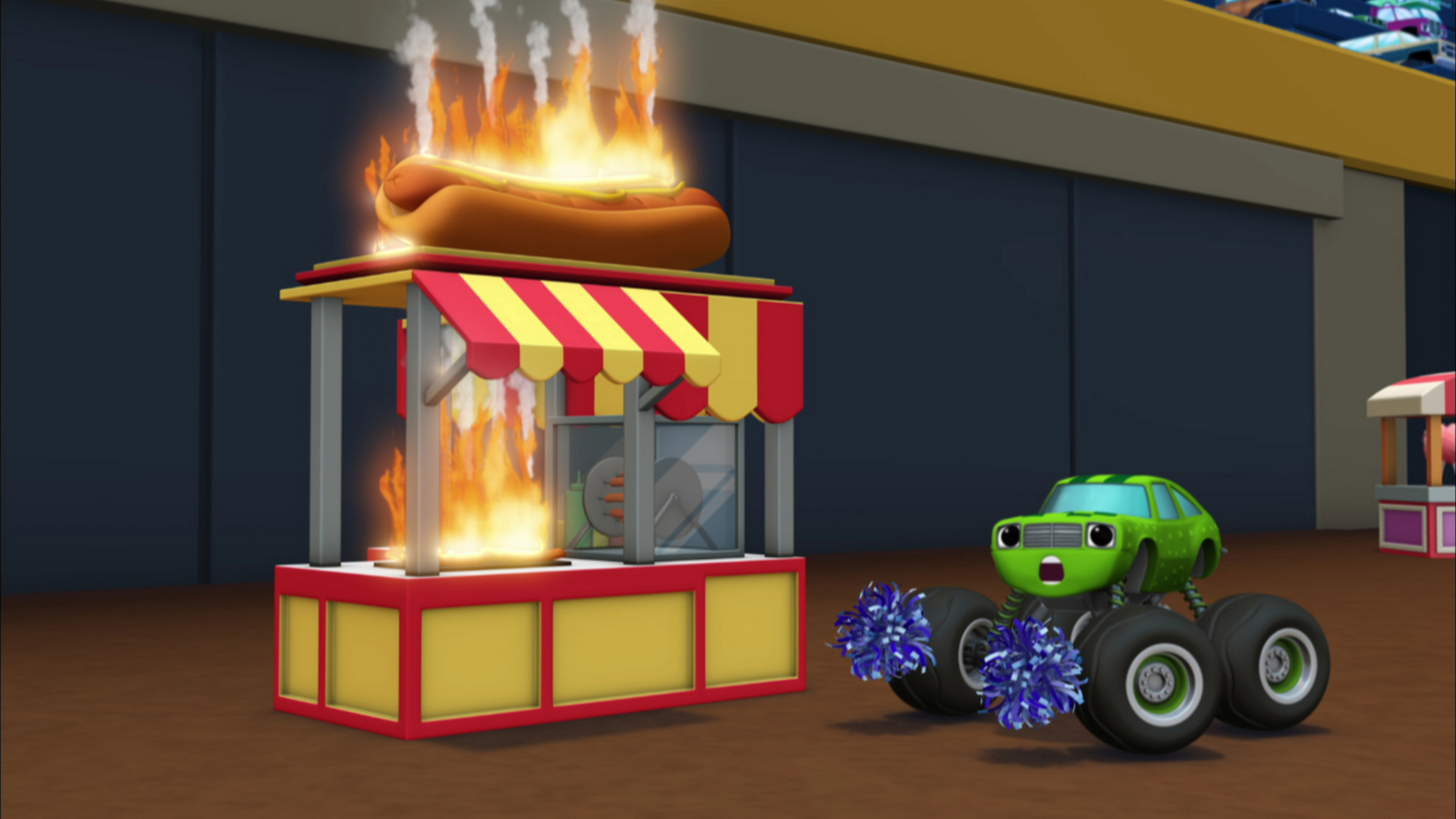 Blaze e todos seus amigos estão brincando na oficina de Gabby, quando percebem que Esmagador deixou uma pizza assando no forno por causa da fumaça que invade o local. Com muita coragem e calma, Blaze guia seus amigos para fora da oficina para que todos estejam a salvo. O chefe dos bombeiros da cidade fica impressionado com a valentia de Blaze.