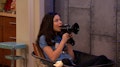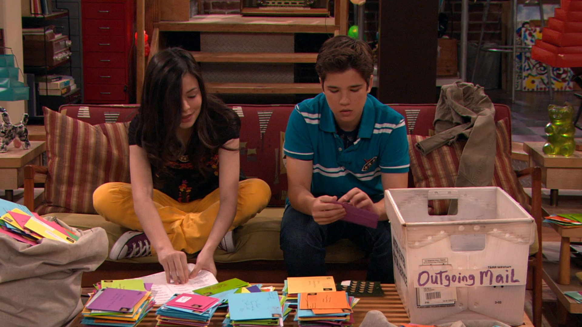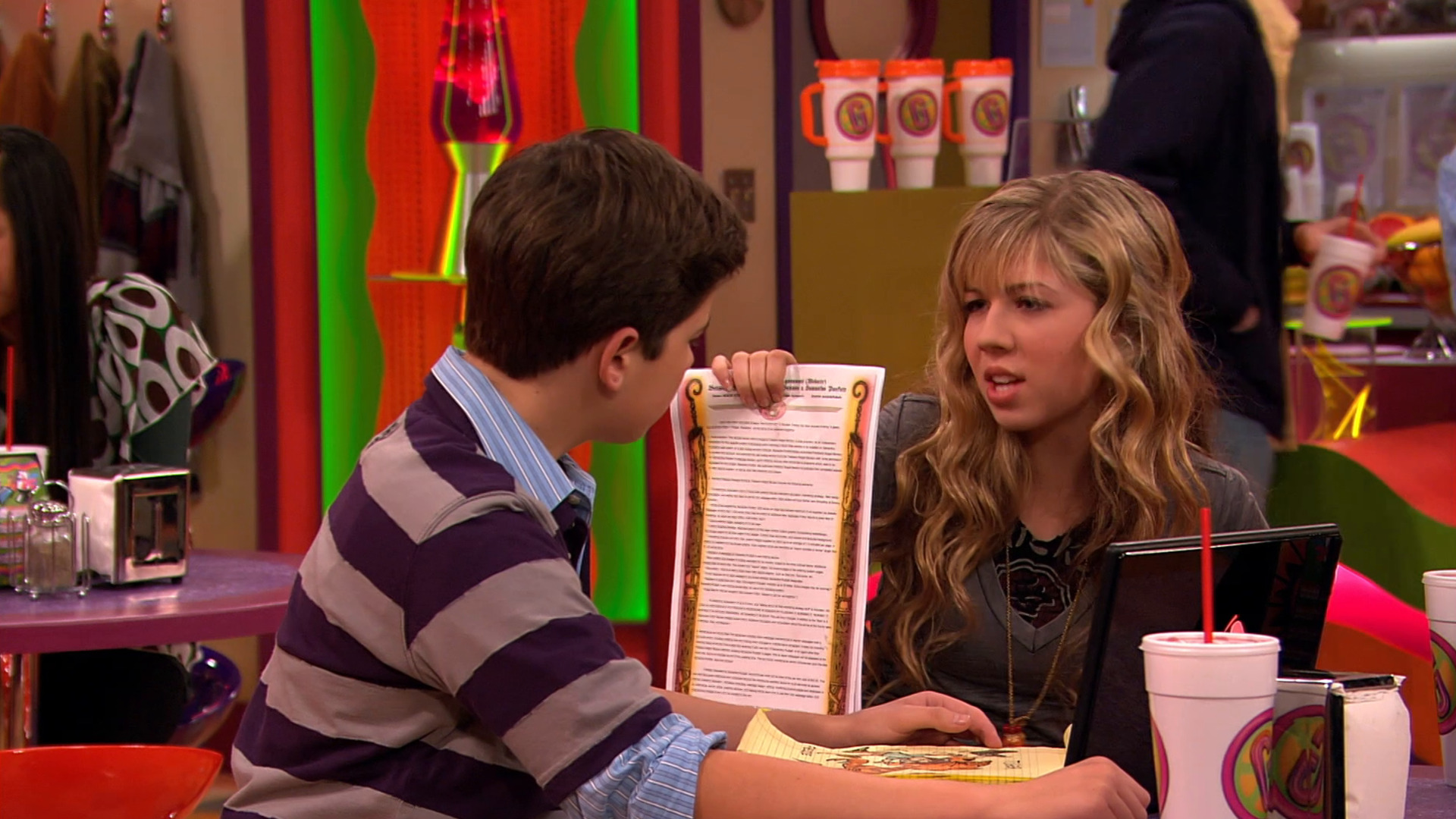 Miranda Cosgrove se reúne juntamente com Jerry Trainor para ver os vídeos dos erros de gravação do programa.