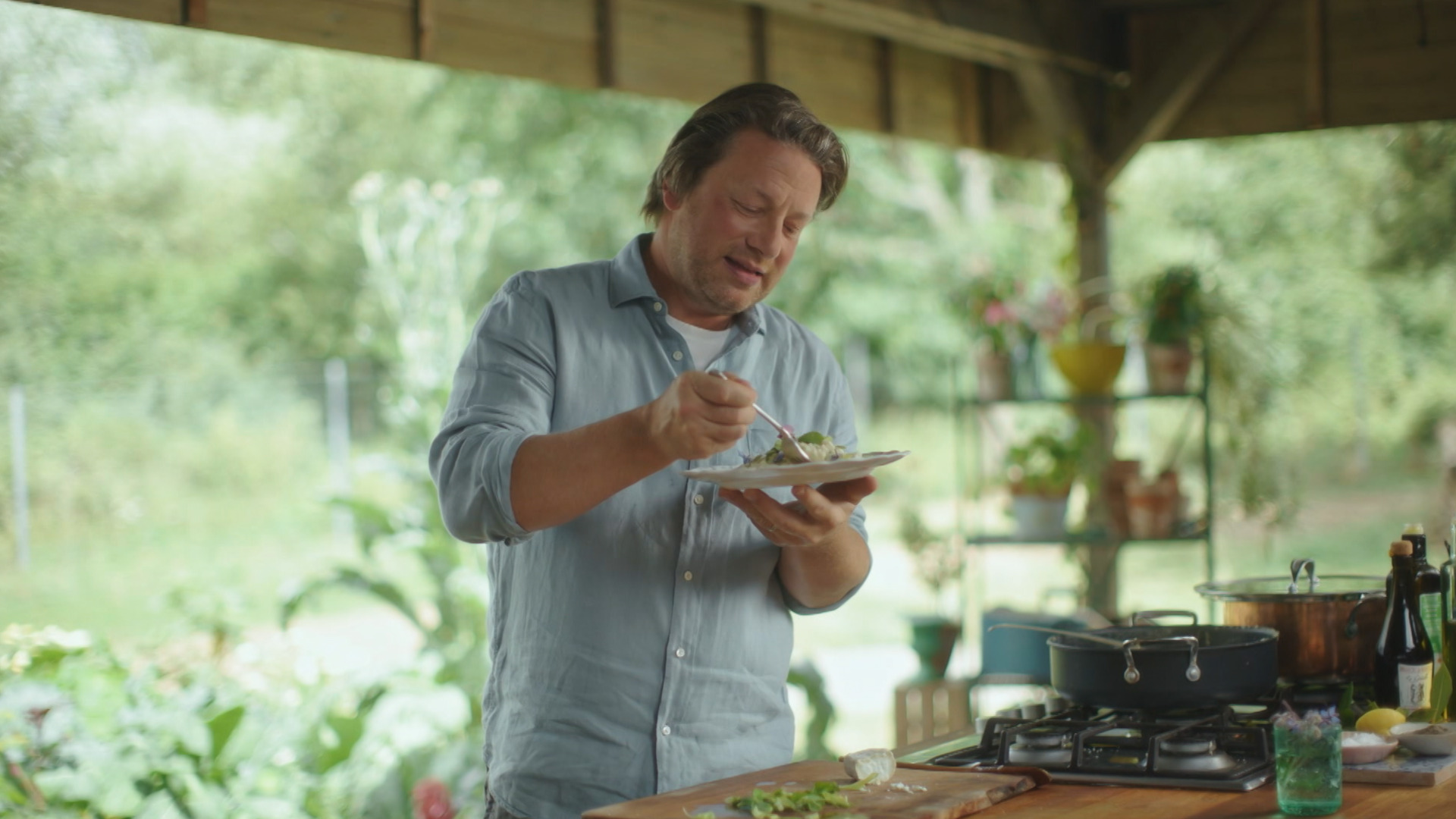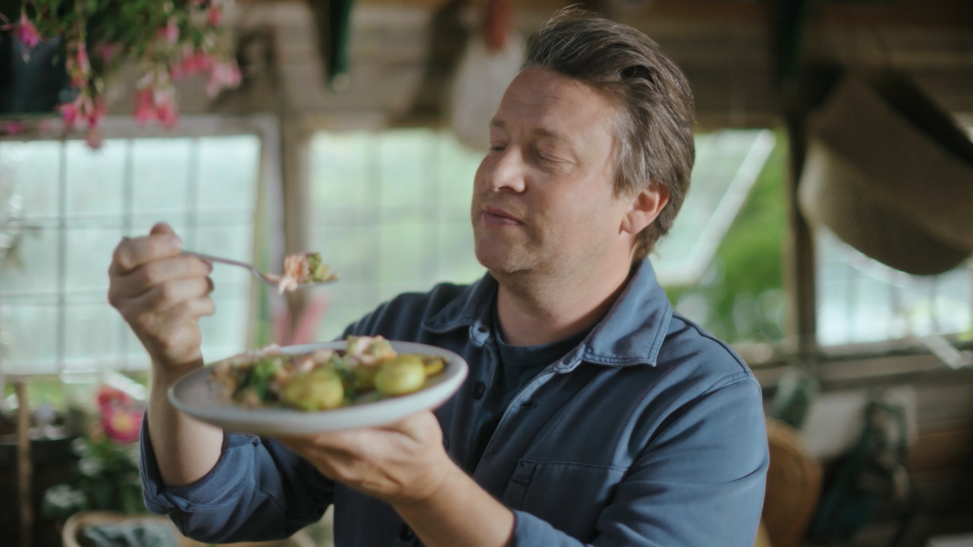 Jamie fejrer foråret ved at lave asparges rullet i bacon, der serveres med fisk og skaldyr fra bæredygtige kilder. Han laver også ravioli med forårsgrøntsager og kylling i karry med forårsløg.