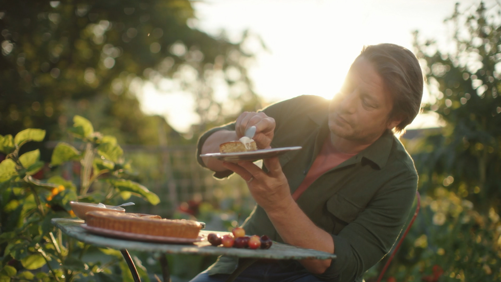 For at afrunde foråret tilbereder Jamie nogle kartofler med en pesto af ramsløg og serverer dem med laks med fyld. Desserten bliver en spektakulær rabarbertærte med mandeldej og mandelkrokant.