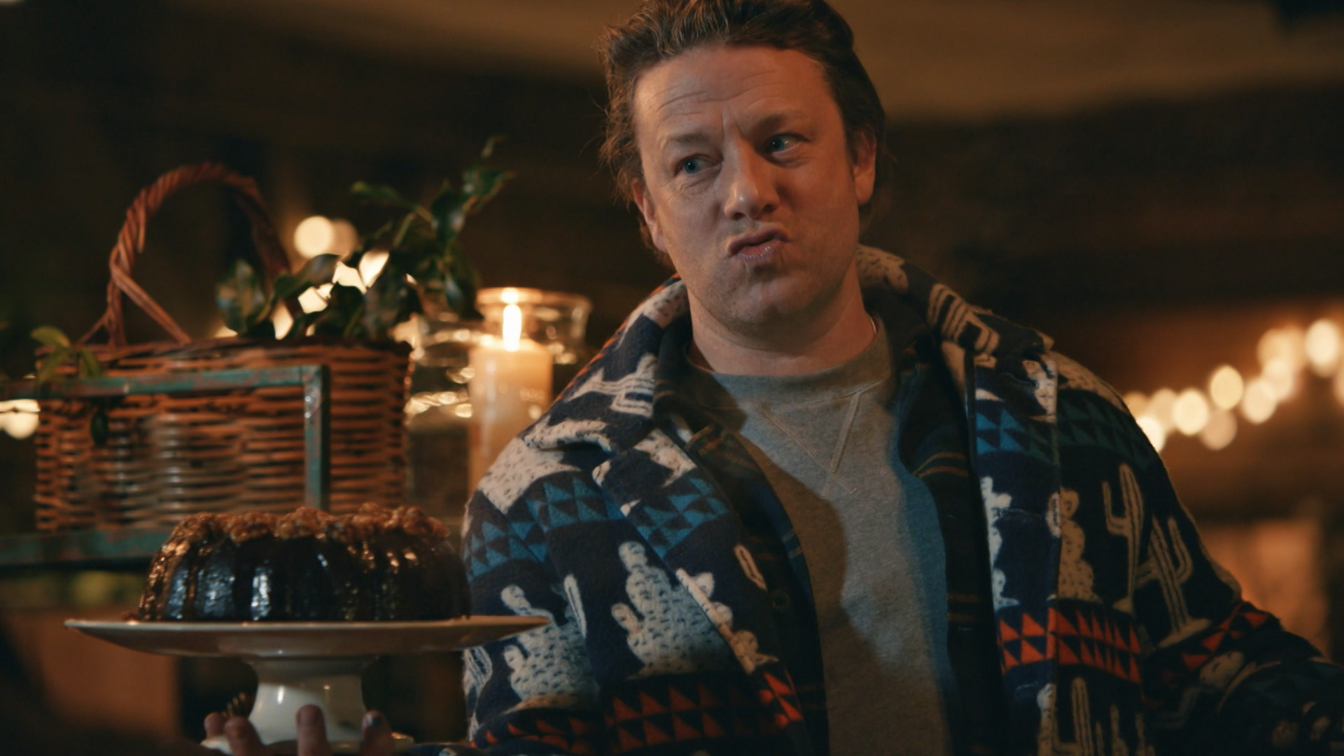 Jamie skal holde julefest, og det første, der står på menuen, er salatblade, som han serverer sammen med filodejspakker med fyld af ost og en syrlig tranebærdip.
