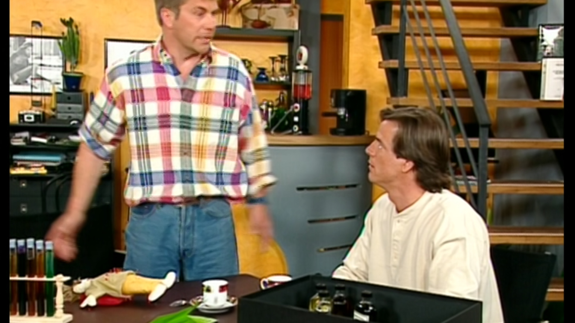 Chez les filles, les enfants sont étrangement calmes, ce qui inquiète Magalie. Une explosion se fait soudain entendre et Vincent avoue que c'est lui qui l'a provoquée, avec son kit de petit chimiste. Alors que Daniel est en rendez-vous professionnel avec Mme Villemarinet, une autre explosion secoue l'appartement.