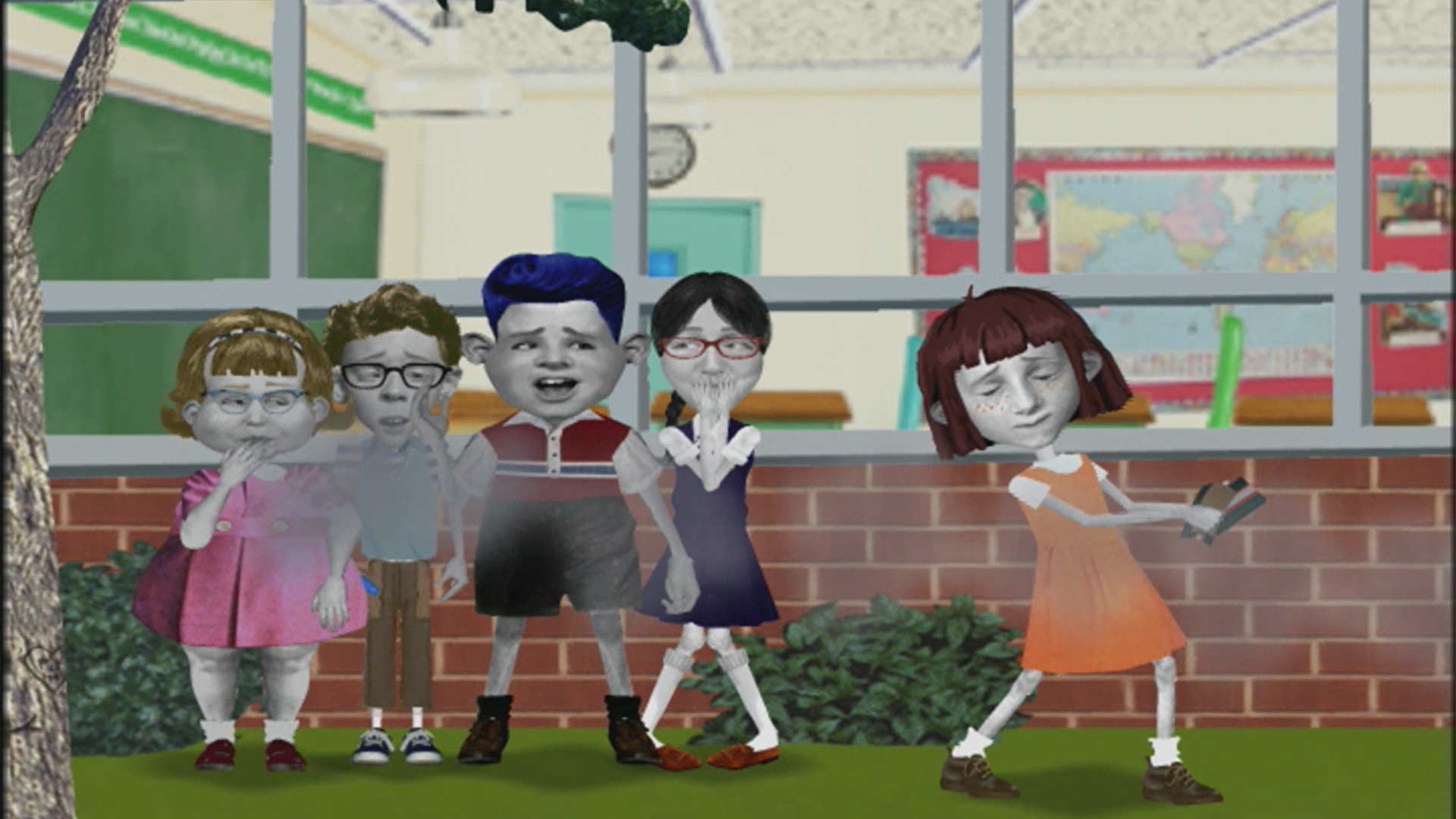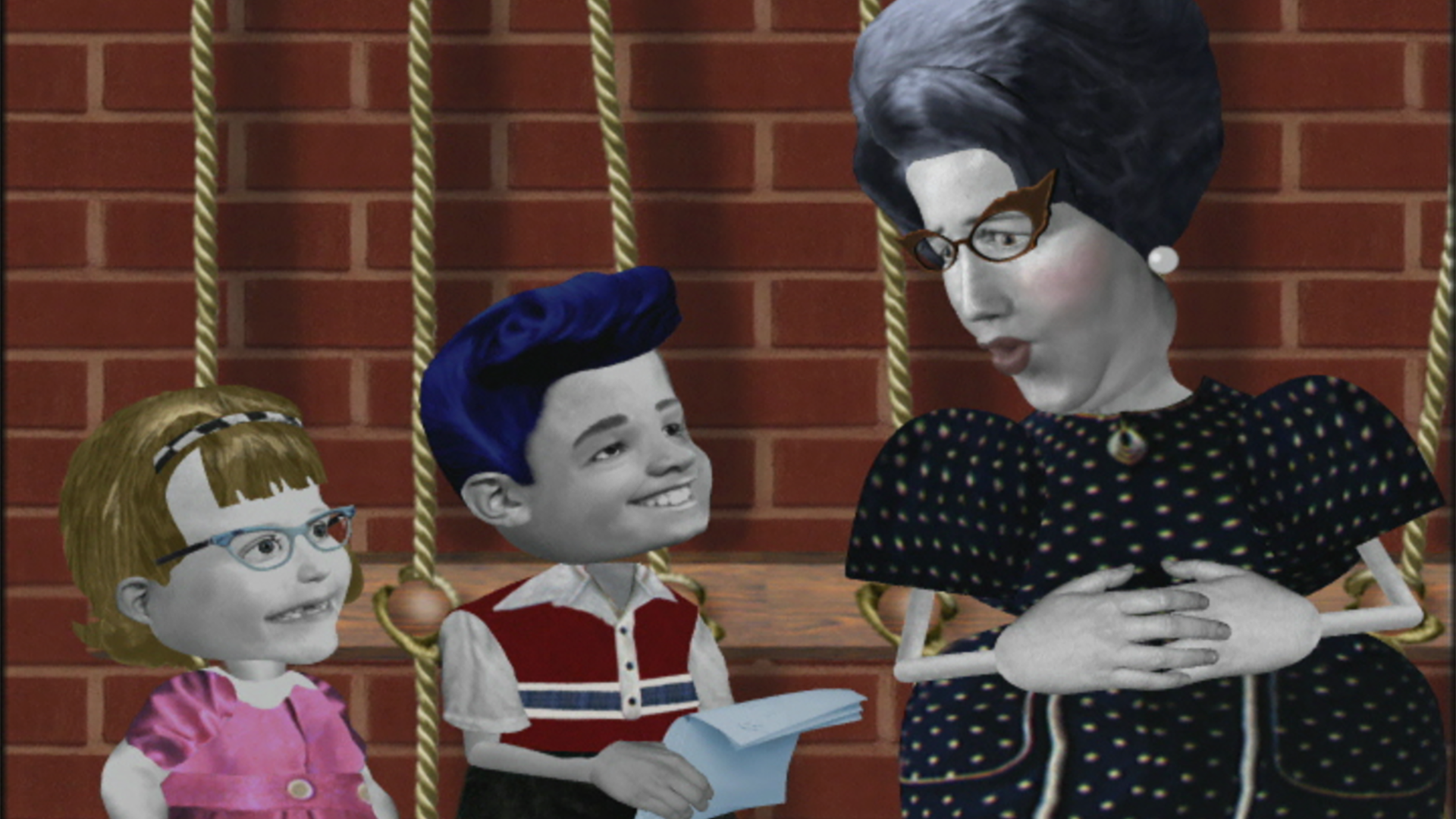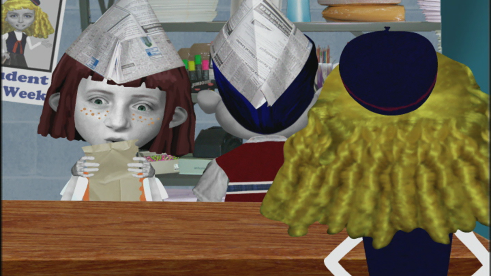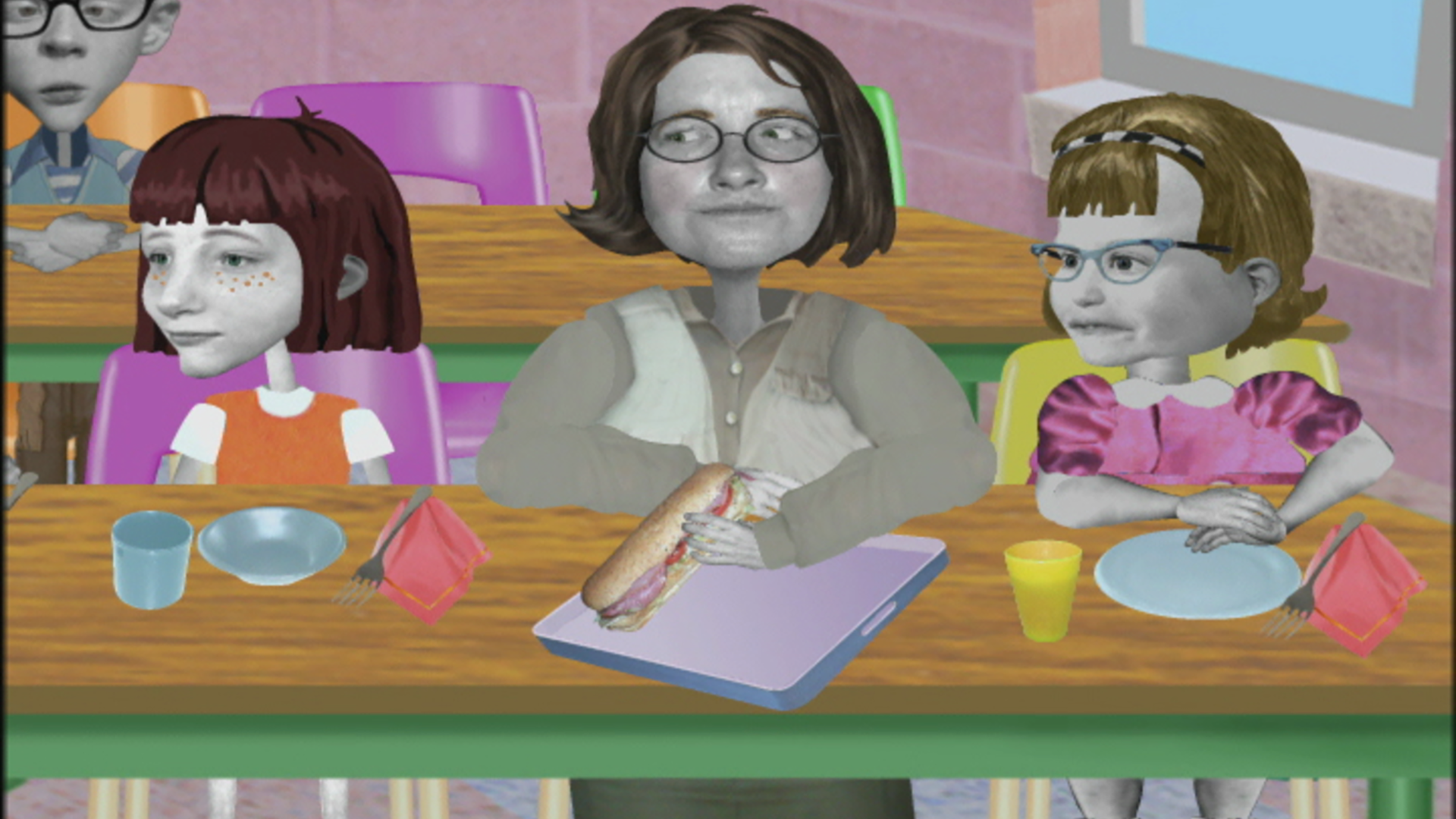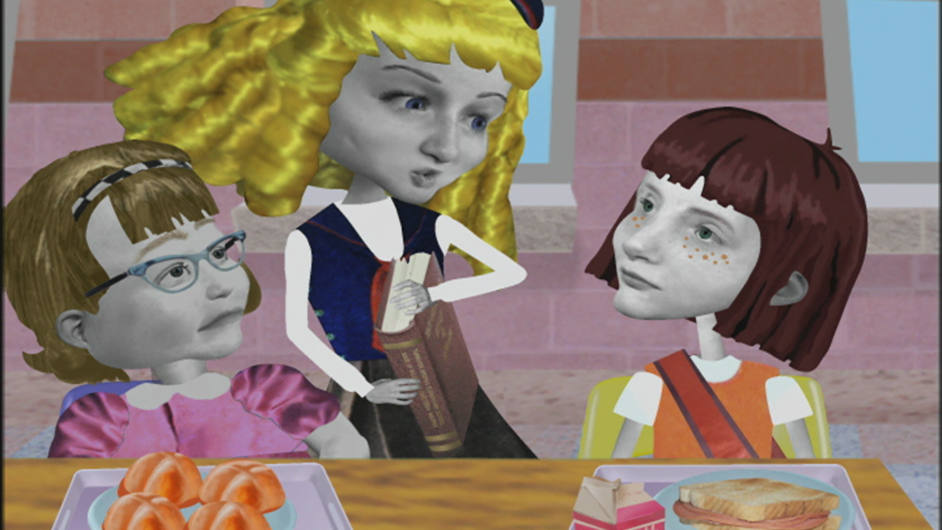 La remplaçante de l’institutrice apprécie Angela. // Nanette sert de modèle, et Angela doit se plier à tous ses caprices.