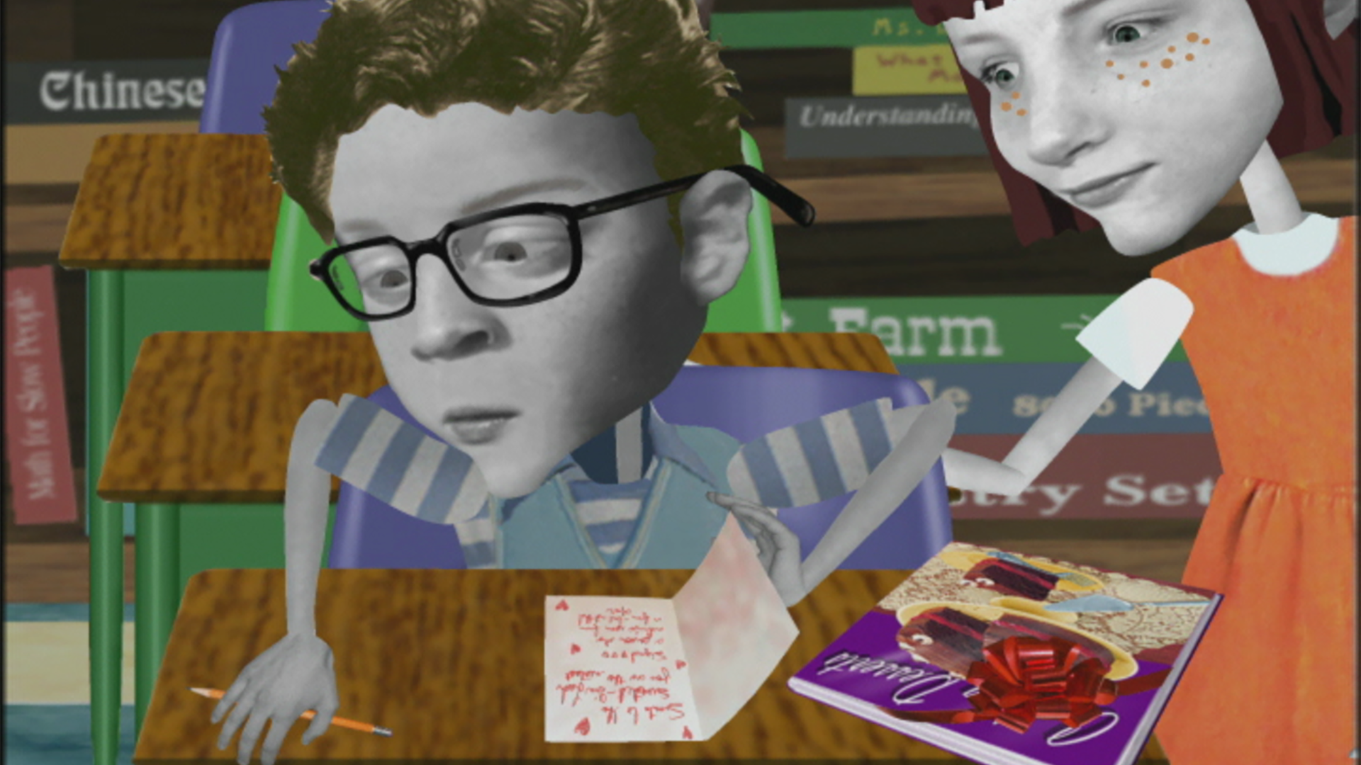 Nanette maîtrise mal ses tables de multiplication. // Angela dessine un portrait horrible de Mme Pète-Sec.