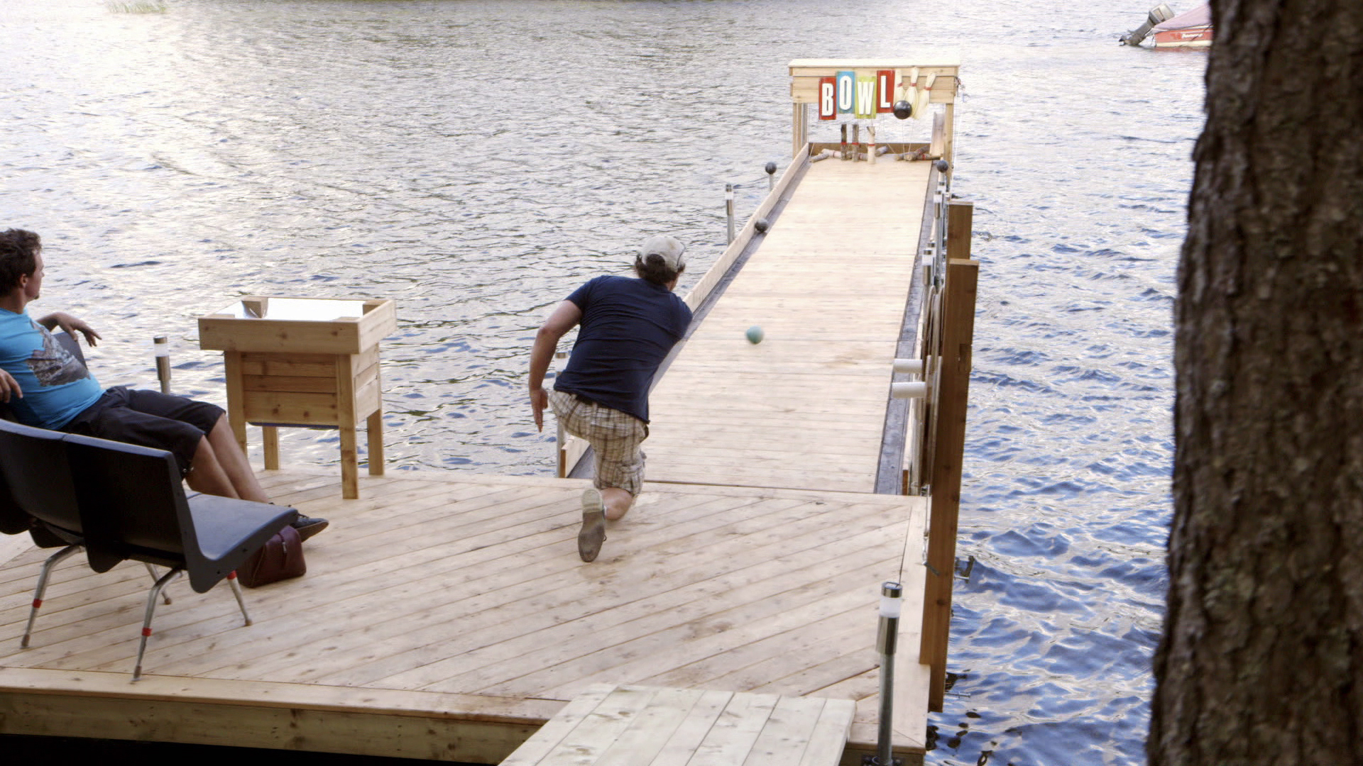 Weil Andrew und Kevin sich nicht entscheiden können, ob sie lieber eine Bowling-Bahn oder einen neuen Steg für ihr Haus bauen wollen, machen sie einfach beides. Die Kombination ergibt dann einen schwimmenden Broject-Bowling-Steg aus Holz.