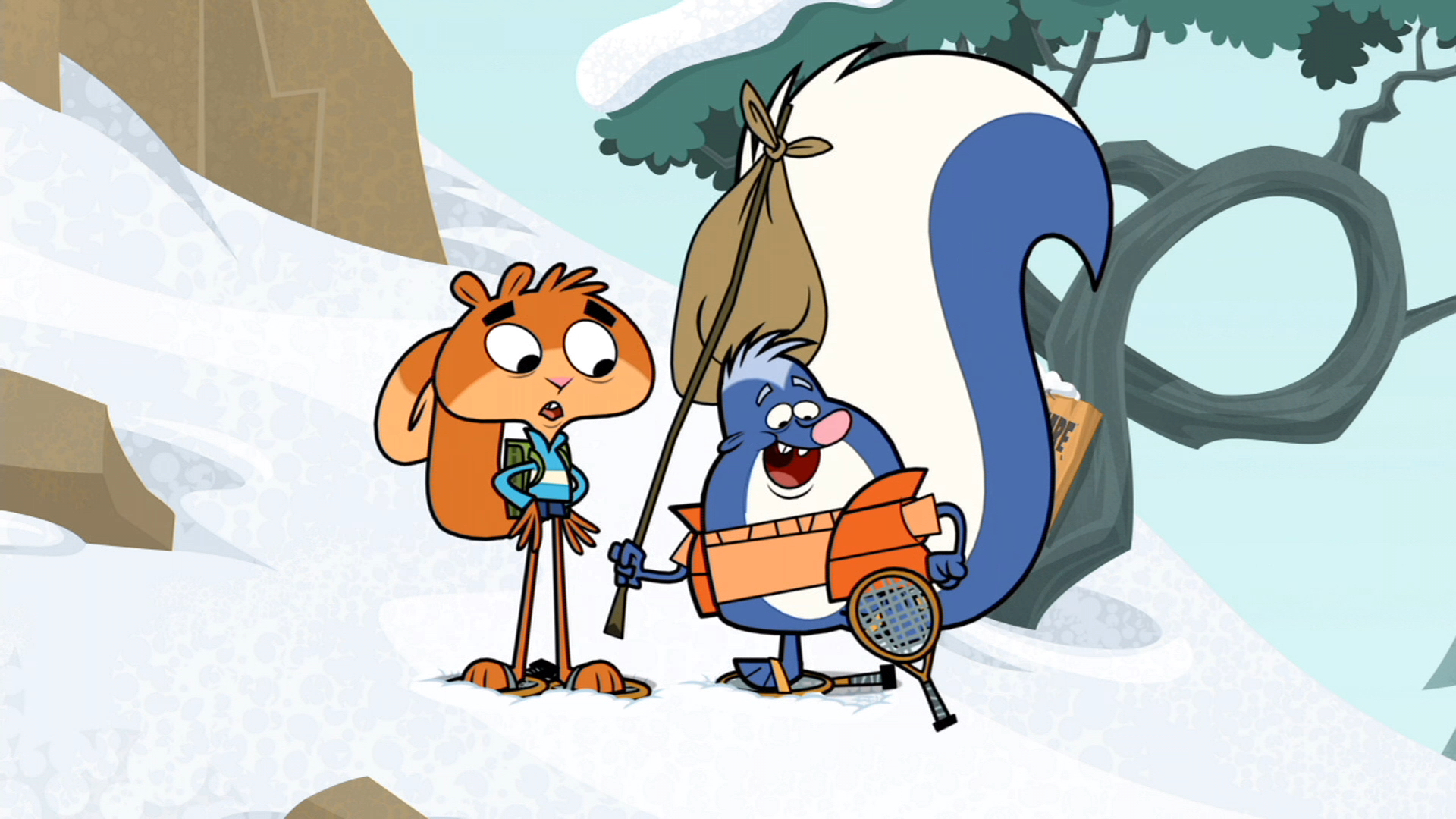 Cuando Ardilla crea una poción que hace a Richard gigante, atrae toda clase de atención. / Ardilla atrapado en la Montaña Balsa durante una tormenta de nieve.