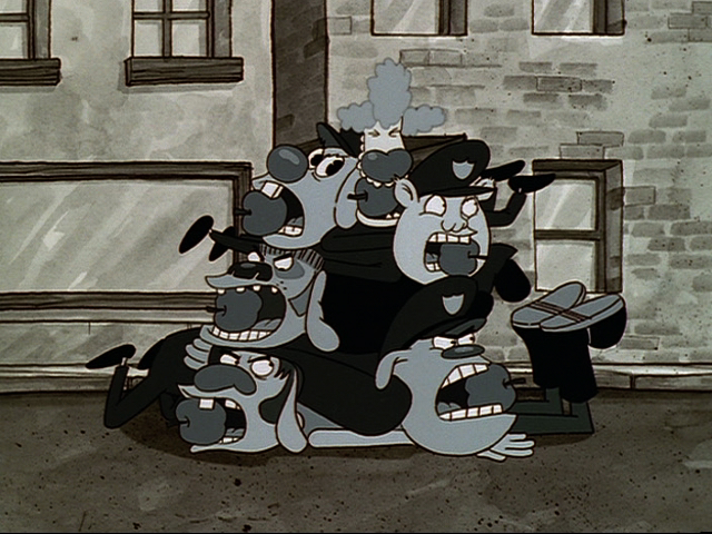 Perro y Gato en bancarrota, bailan en la calle, pintan retratos de las personas y venden una manzana podrida a Cliff, el perro Grasoso. / Aparece un gorila en la casa de Perro y Gato justo cuando estaban saliendo al bowling.