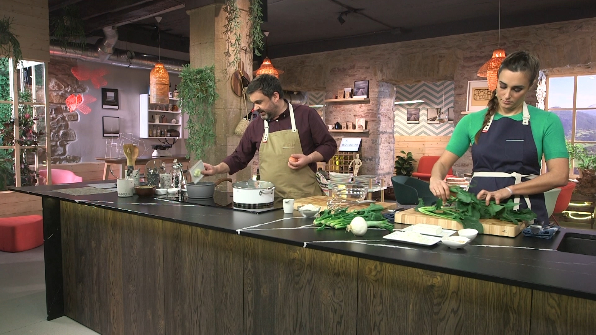 El cocinero Ander Gonzalez elabora una receta mientras la nutricionista Gabriela Uriarte explica las propiedades de los ingredientes utilizados y analiza el equilibrio dietetico de las recetas.