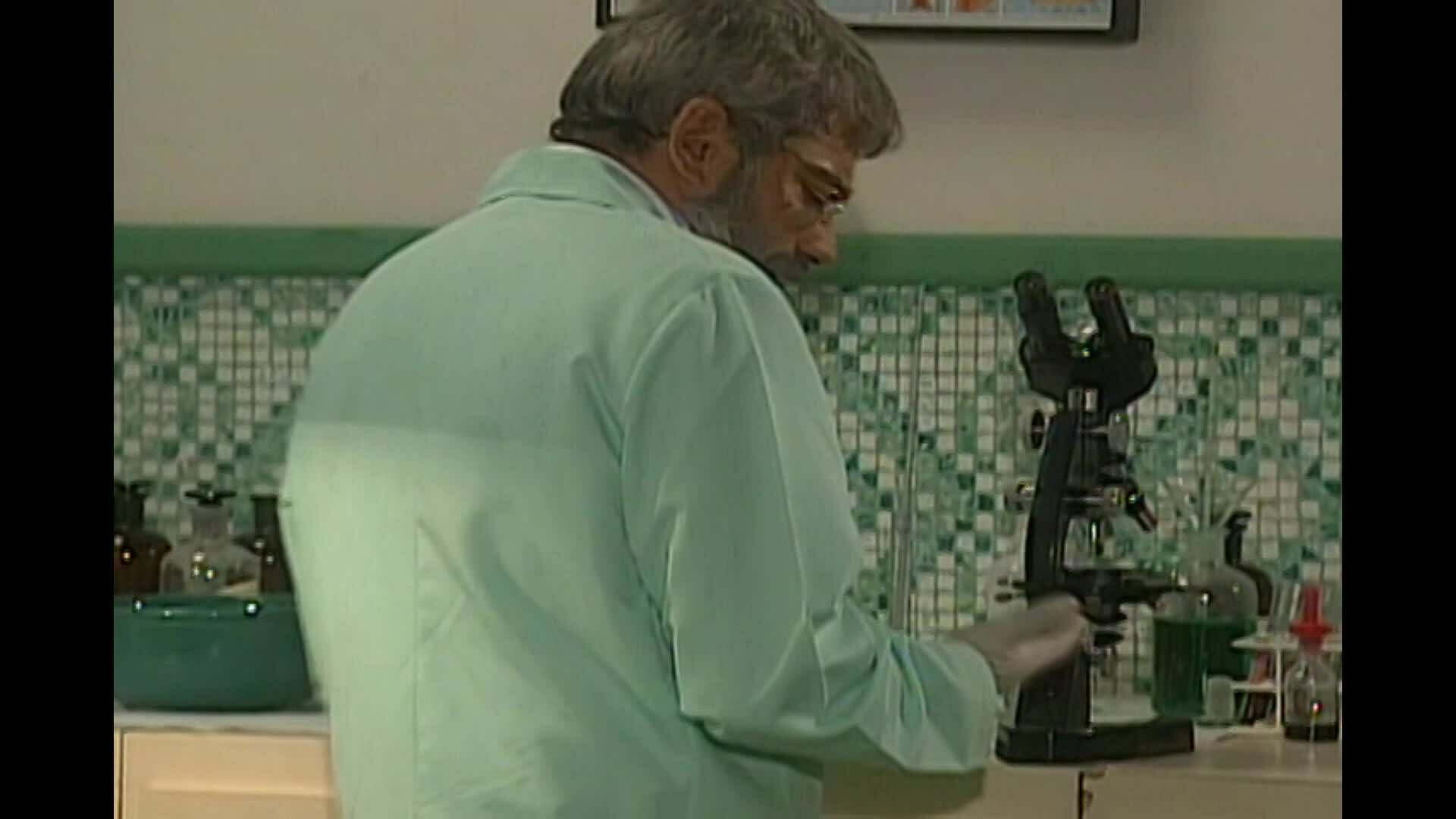 En el momento que la esposa de Augusto se queda a solas en el consultorio médico aprovecha para cambiar los nombres de los tubos de sangre.