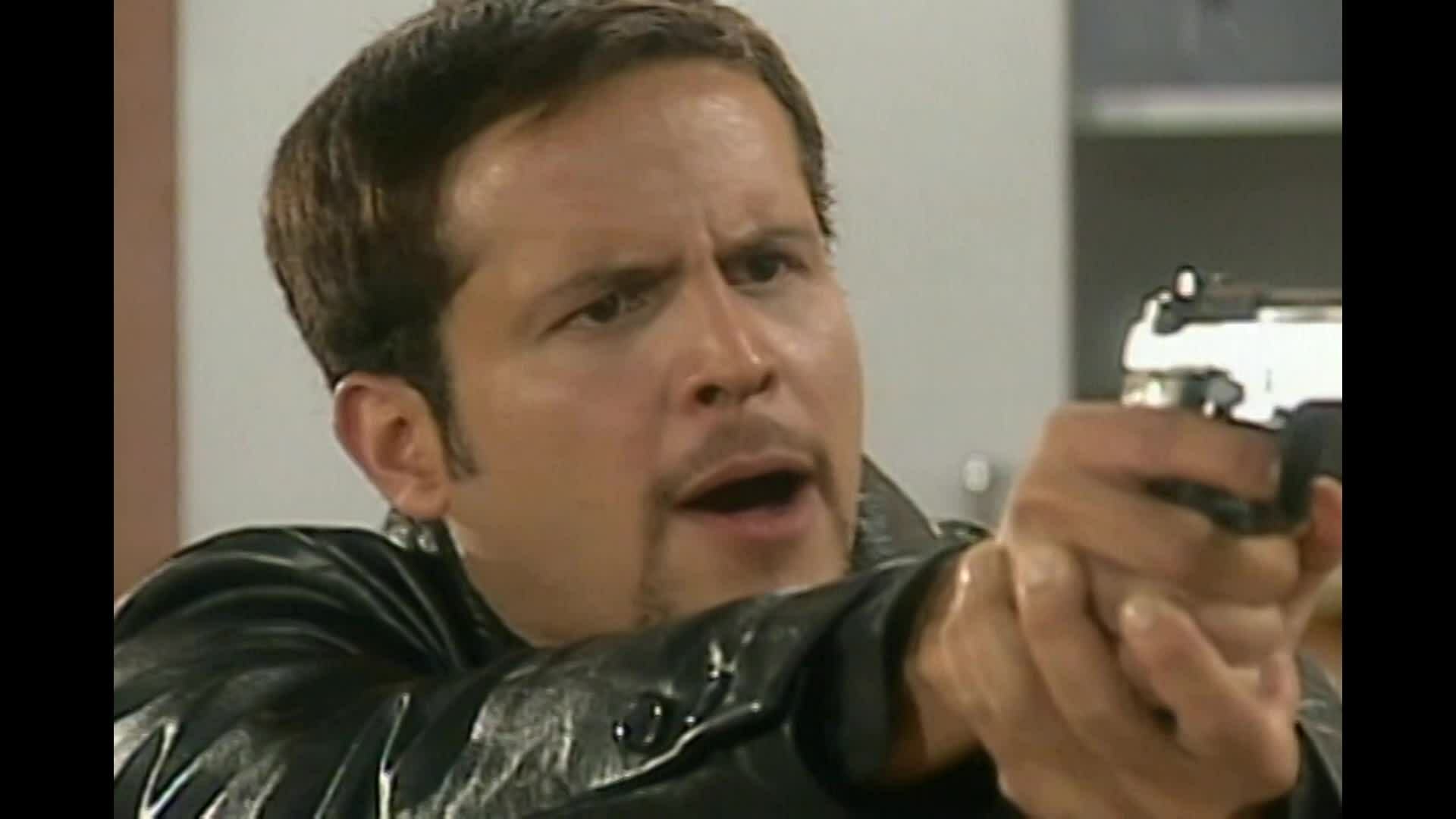 Santiago entra cautelosamente a su apartamento, pues observa que la puerta está abierta. De pronto, siente una pistola fría en la nuca.
