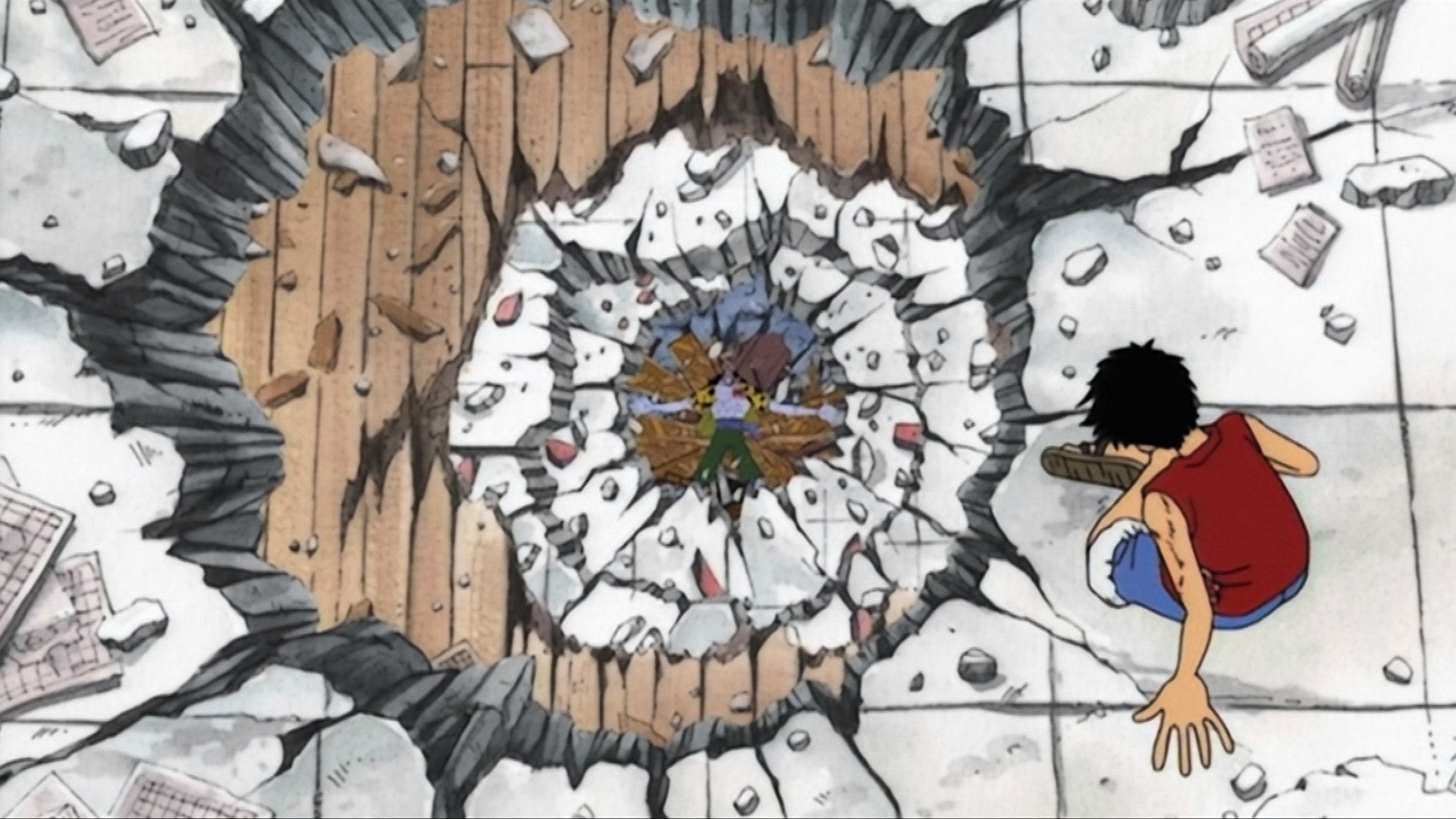 A base de testarudez y fuerza a partes iguales, Luffy consigue romper la lanza explosiva de Krieg, lo que hace que la batalla entre en su punto álgido.