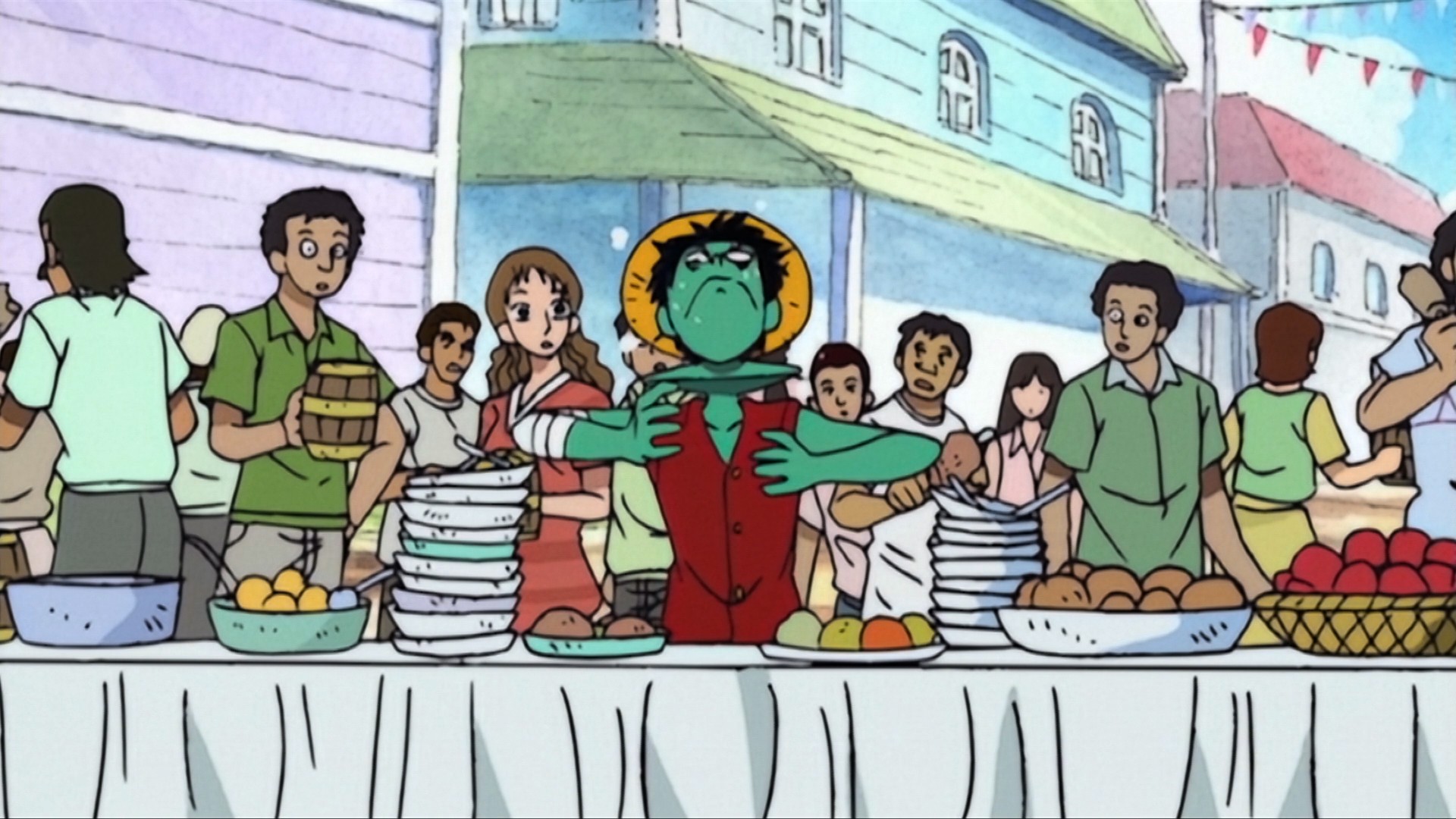 Sanji descubre que en la ciudad se pueden conseguir peces de otras regiones del mundo, como el atún elefante de aletas azules, así que participará en un duelo culinario para conseguirlo como premio.
