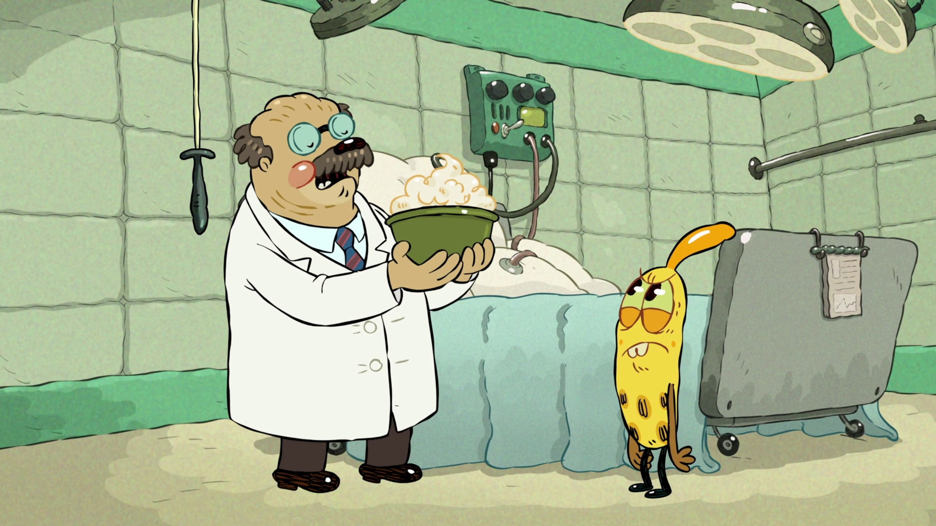 La pandilla necesita ir al hospital para comer el mejor puré de patatas del mundo. Banana acepta participar en un juego de apuestas, el Cerdo le hace una cirugía al Viejo pasa gruñón, la Cabra cura a Tony Toalla y el Grillo se provoca una enfermedad.