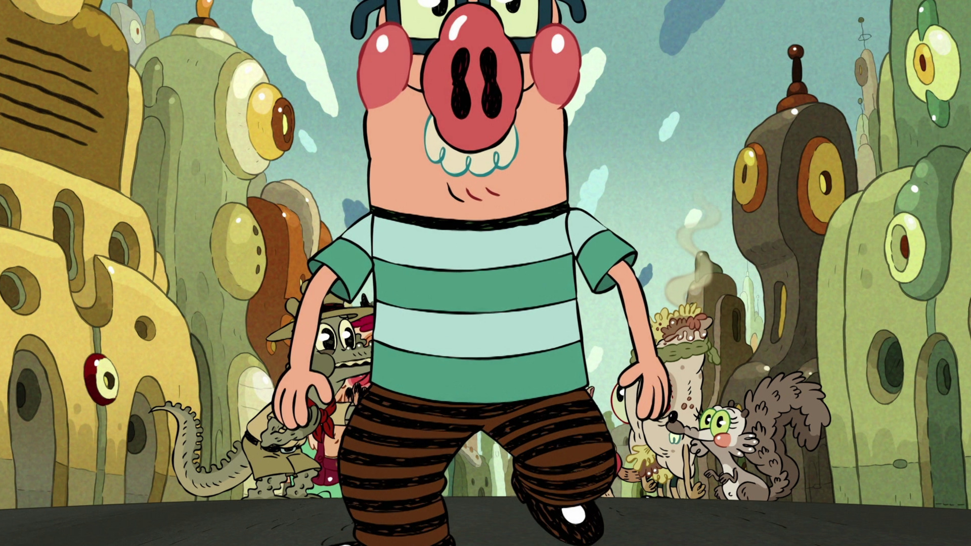 El grupo debe disfrazarse para ocultarse de un peligroso criminal: El Cerdo como profesor, la Cabra como mujer de negocios, Banana como plomero y el Grillo como un bebé.