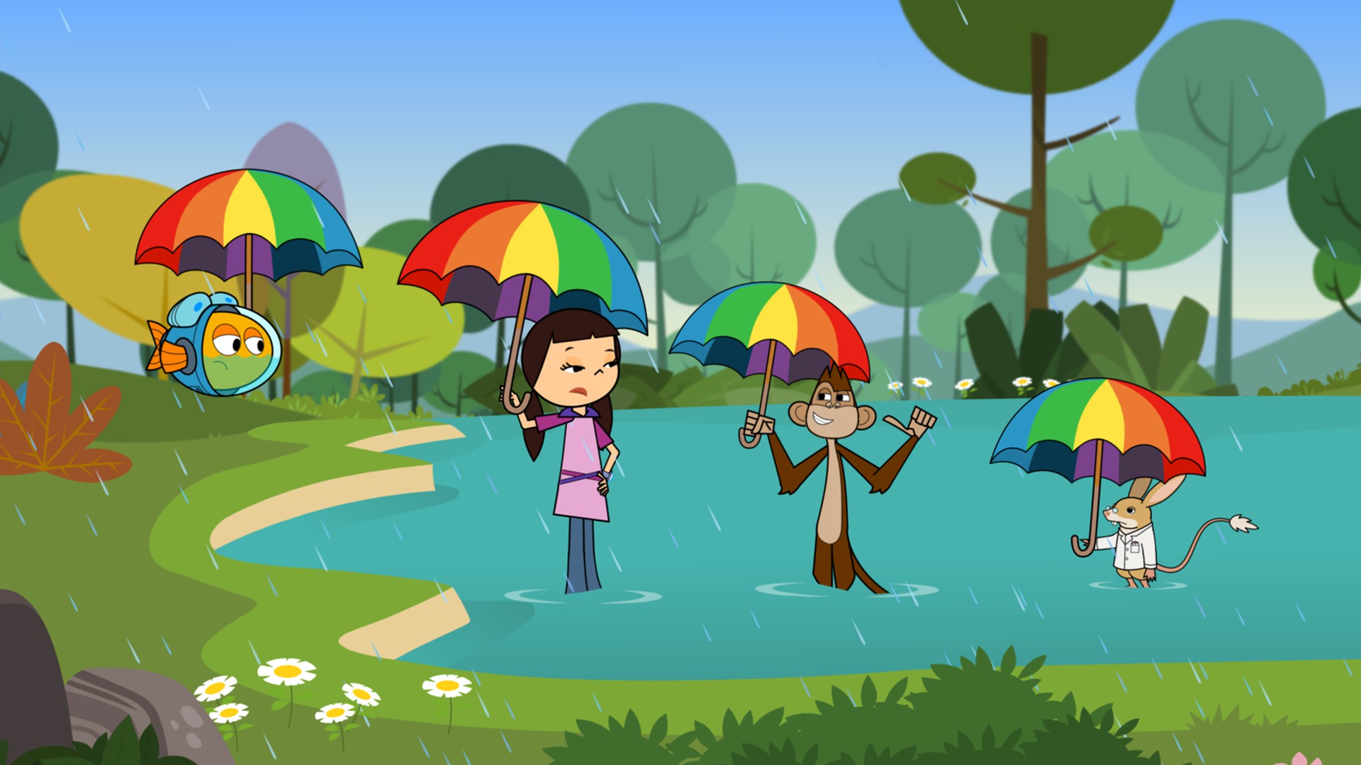 Nuestros héroes ven varios arco iris encima del parque a pesar de no haber caído una sola gota de lluvia. El responsable de esto es un jerbo inventor que trabaja en la fabricación de una maquina para hacer caer lluvia.