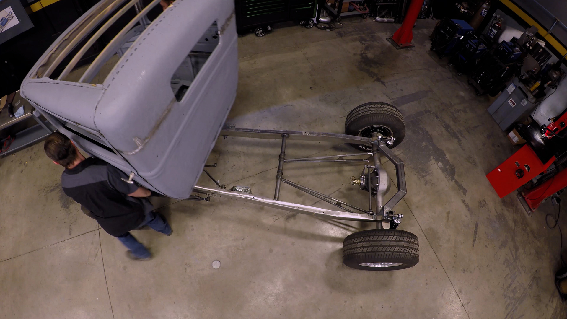 Para bajar la Ford Street Rod del 30, los chicos cortaron el chasis por la mitad y la bajaron 8 pulgadas.