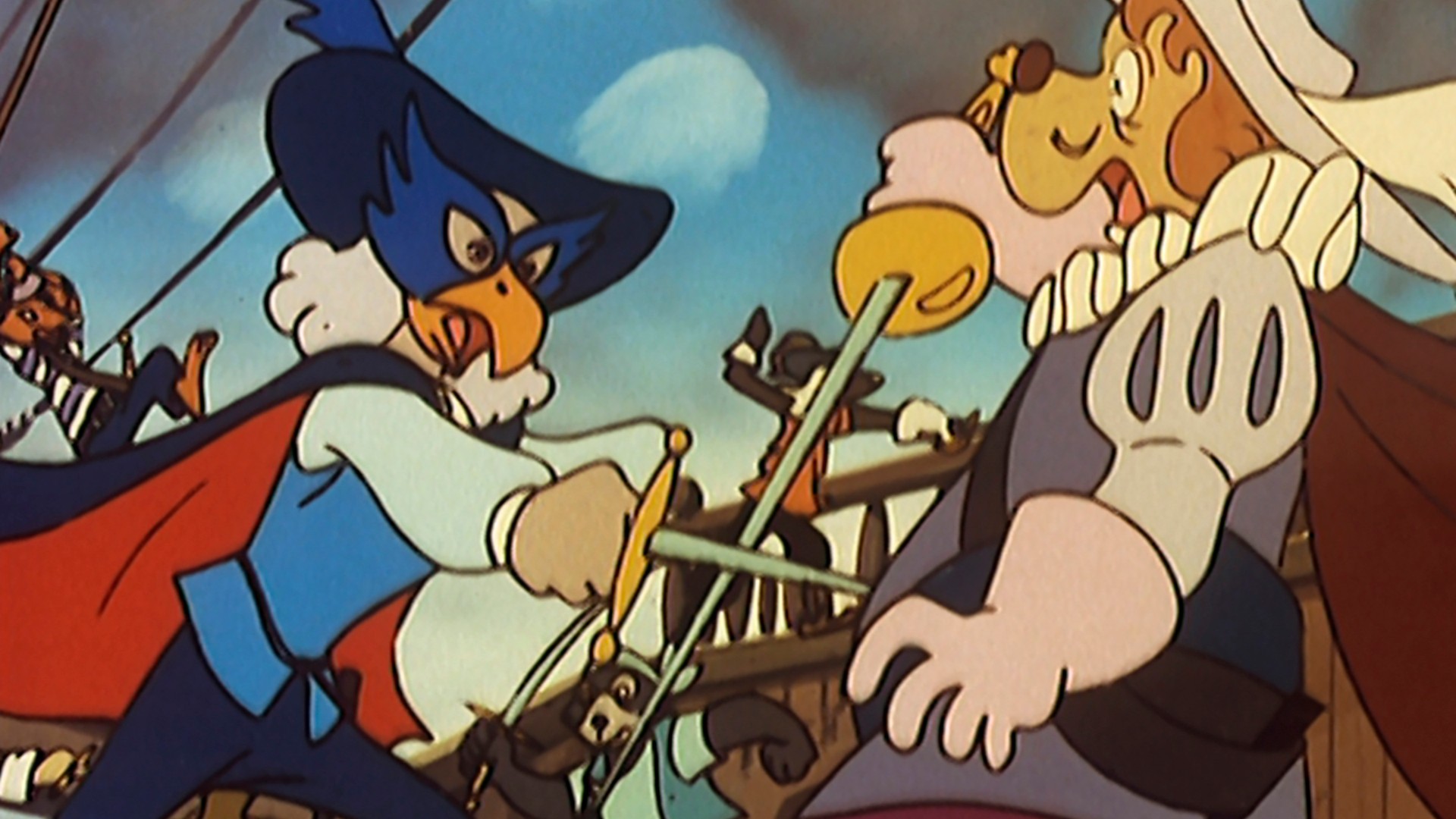 Cómo D’ARTACAN llega demasiado tarde al Palacio de Buckingham. A pesar de los esfuerzos de los hombres del Cardenal RICHELIEU por detener a D’ARTACAN y a POM, éstos consiguen, con la ayuda de los TRES MOSQUEPERROS, tomar rumbo a Londres.
