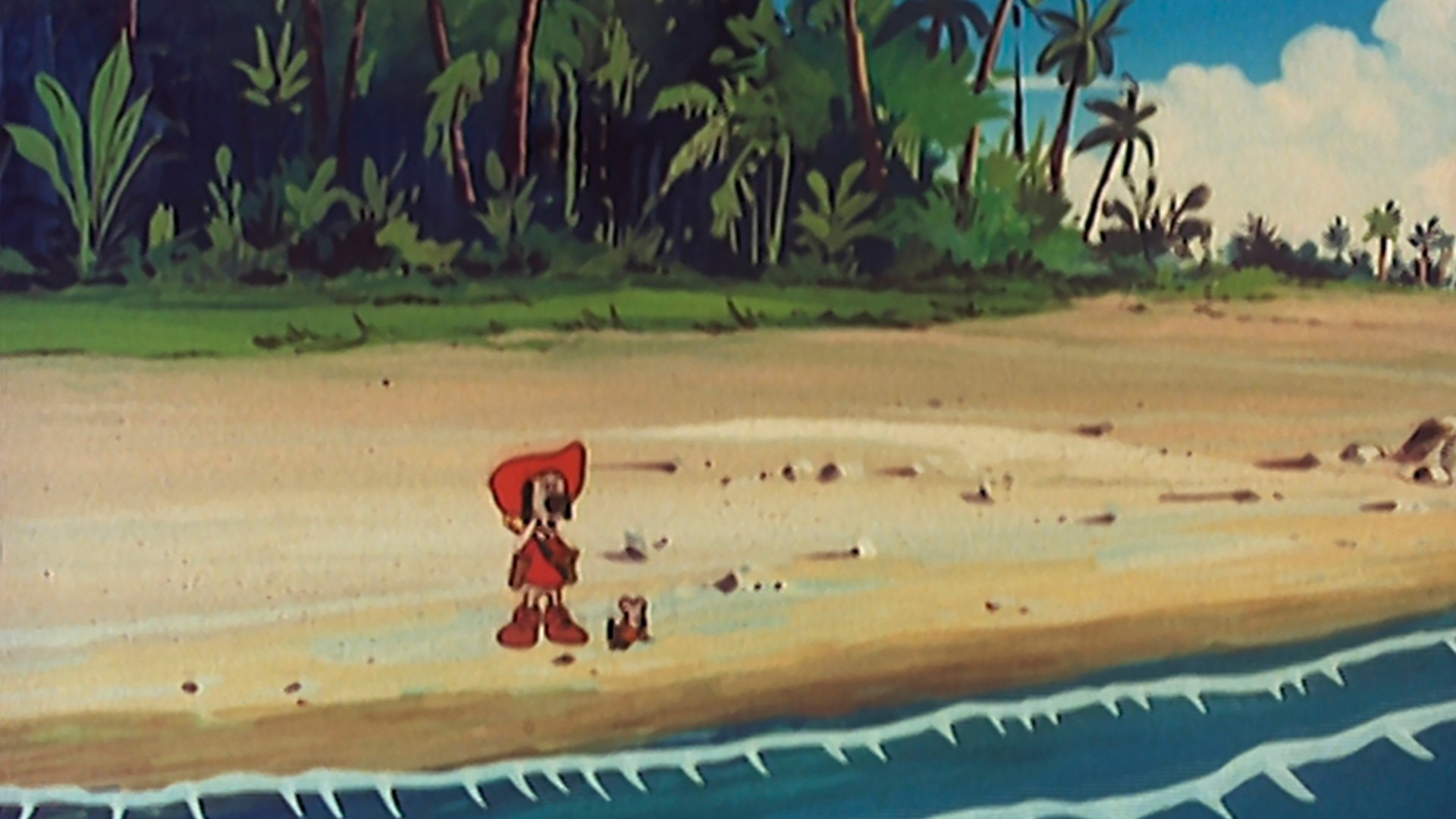 Cómo D’ARTACAN encuentra el tesoro. Después de vivir un sinfín de aventuras con animales salvajes y los Indios que habitan la isla, D’ARTACAN y POM se ocultan en una cueva donde descubren una piedra preciosa.