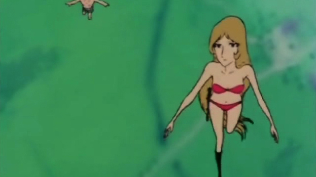 The inside of Ballera has become hollow. Tetsuro and Maetel are swimming around in the air when they're attacked by some cowboys and it causes a big commotion.