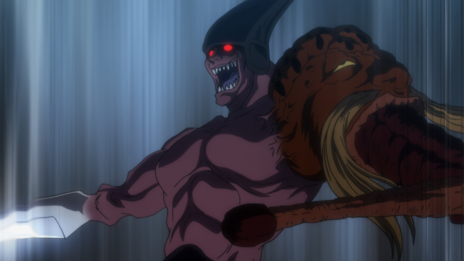 Morel has been chased into an underground church by the lion-type Chimera Ant, Leol.