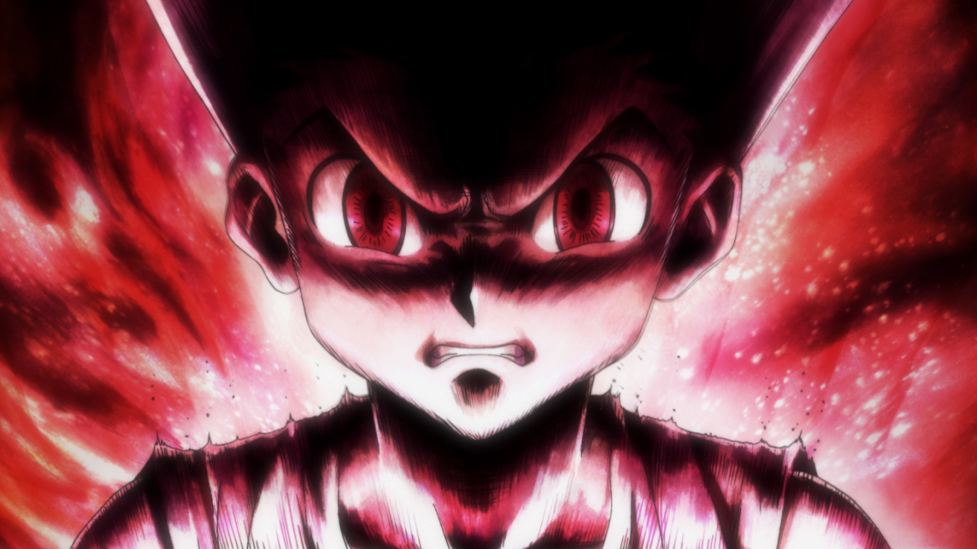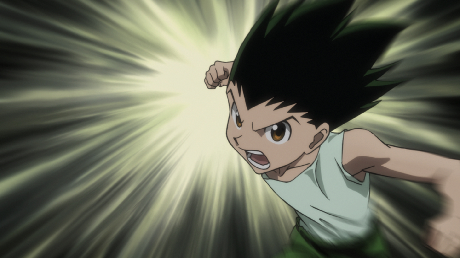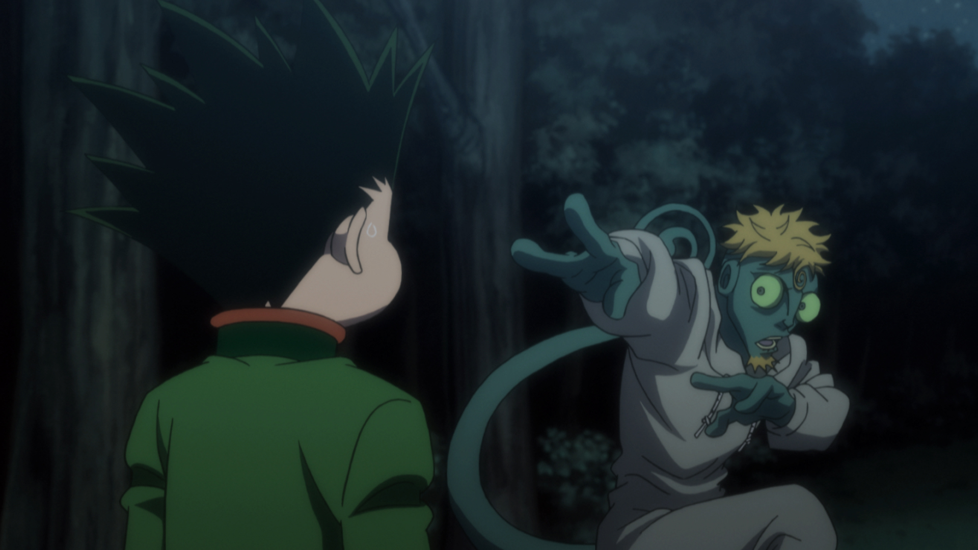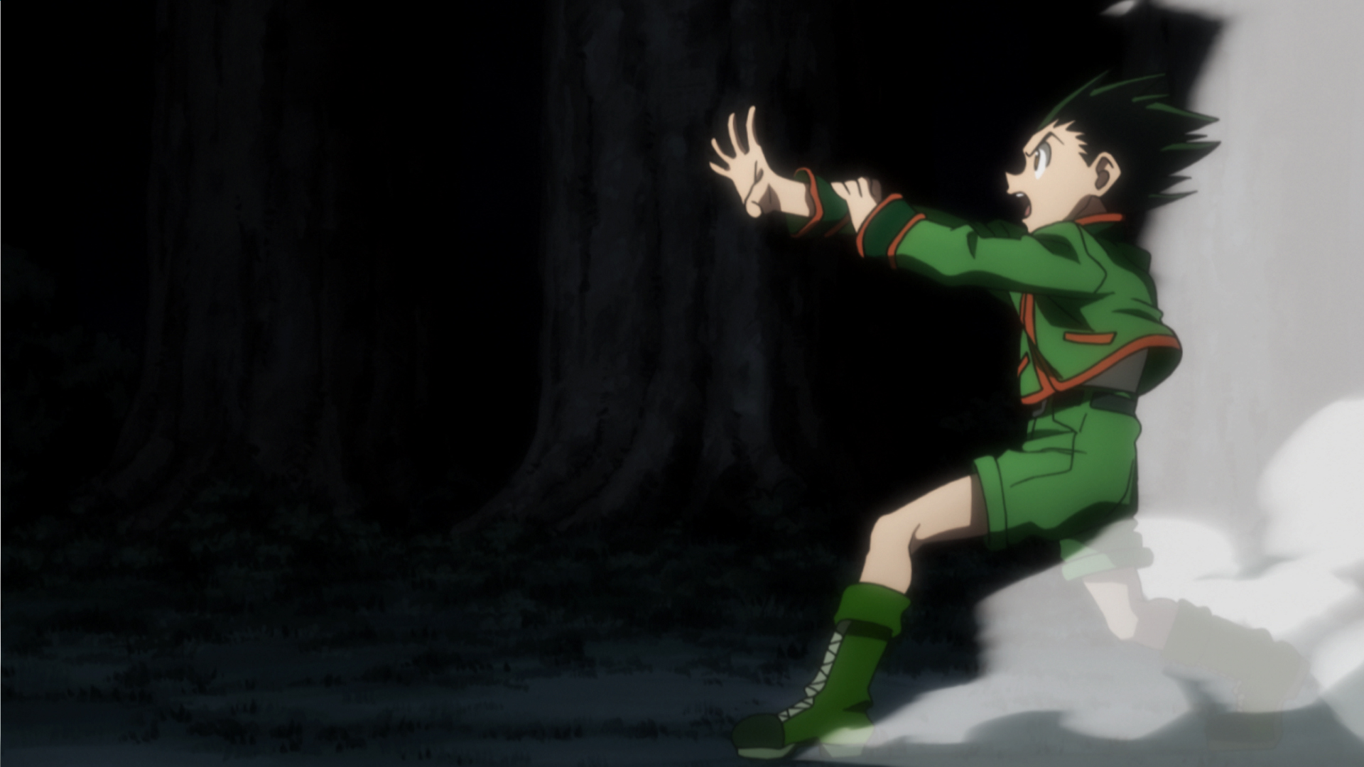 A pair of Chimera Ants appears and hunts Gon under the cover of night, overwhelming him with their attacks. Feeling that things are at a standstill, he gathers up his Nen and prepares to throw a punch.
