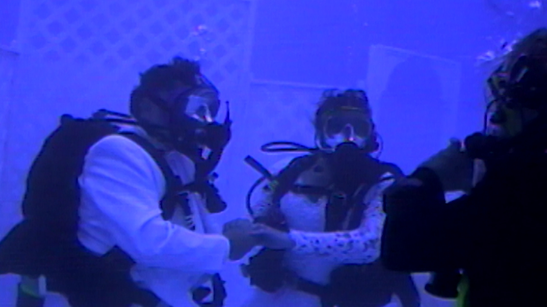Two couples ‘ take the plunge’ in more ways than one: a Missouri couple dons oxygen tanks to exchange vows in the deep end of a swimming pool.
