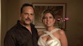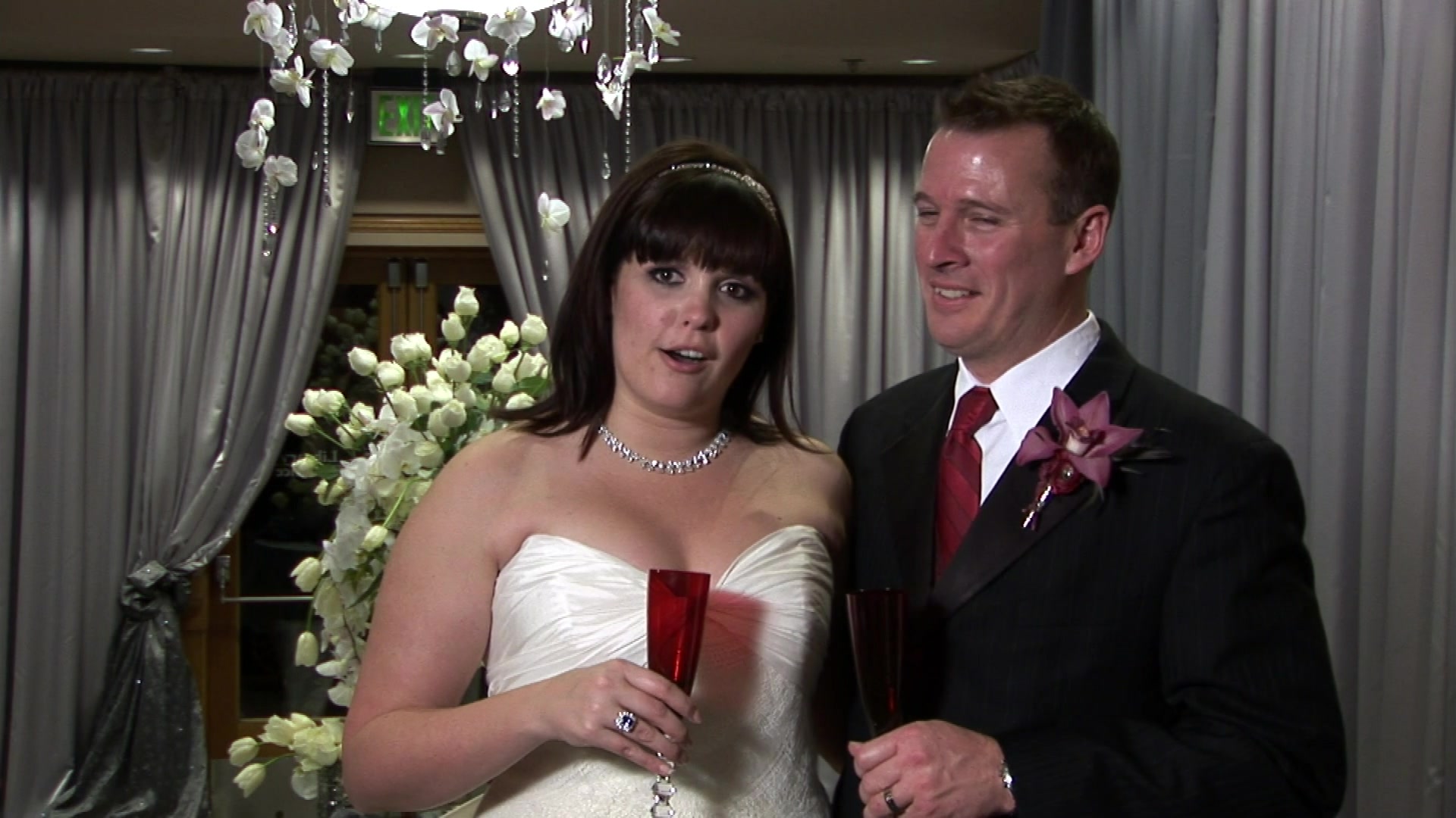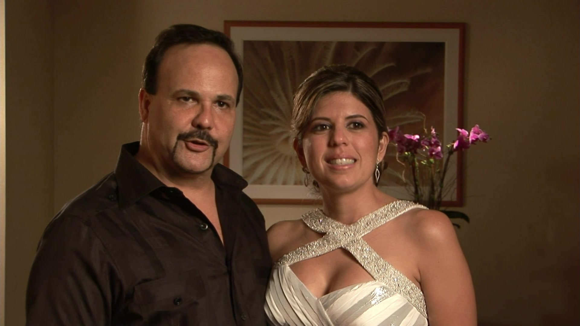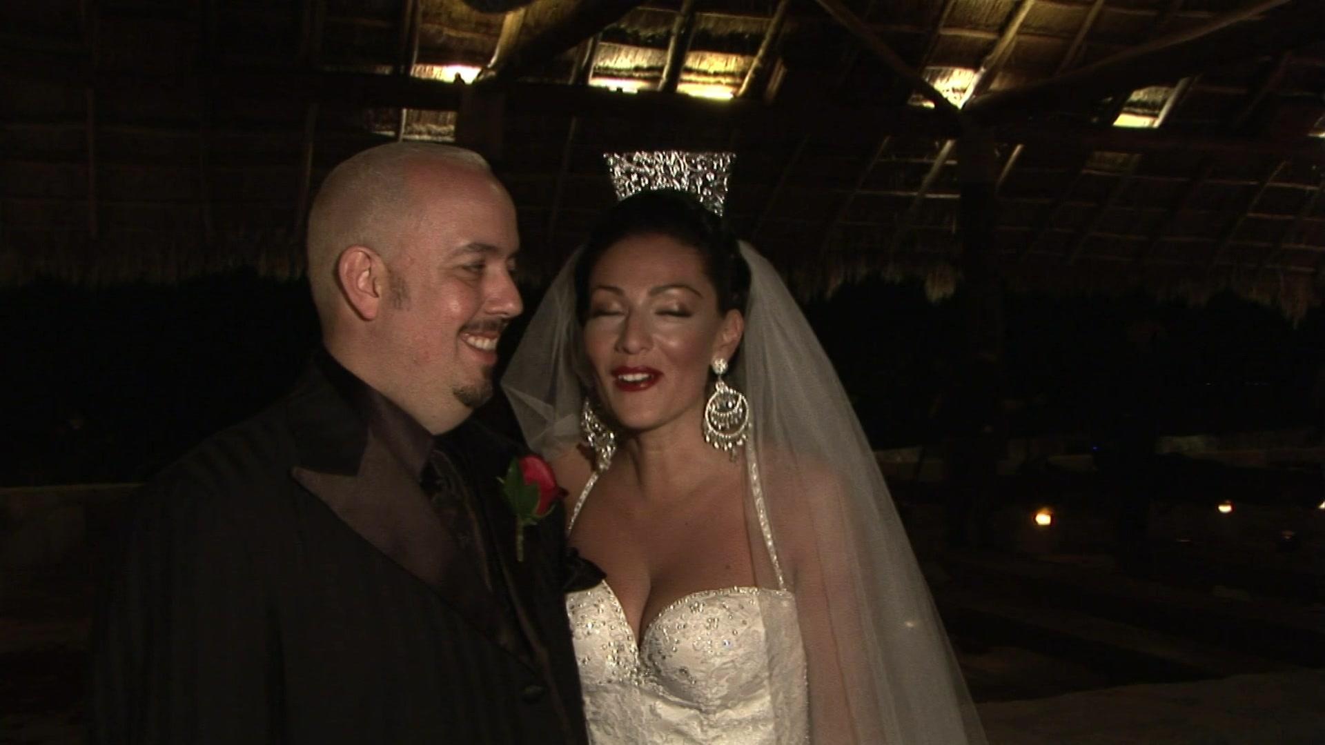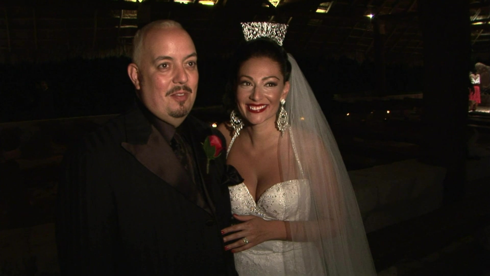 These two lovebirds celebrate their nuptials at the extremely secluded South Seas Island Resort off the Florida Coast. Their guests are captivated by the orchid chandeliers, glittering carved ice elements, and a Miami-club themed after-party.