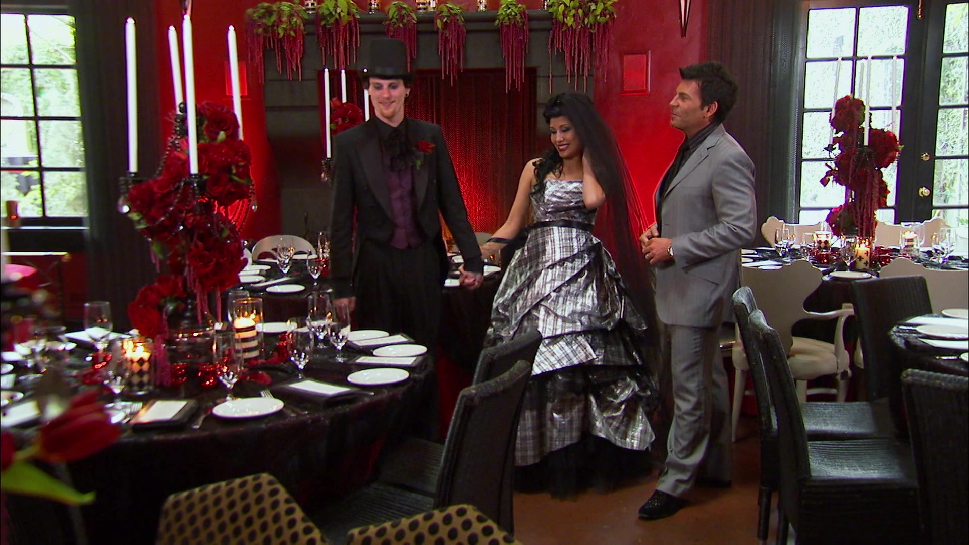 Bride Berda is getting married on Halloween. Her wedding decor features plastic pumpkins, spider webs, and skulls. David Tutera transforms her ticky-tacky theme into an elegant masquerade ball.