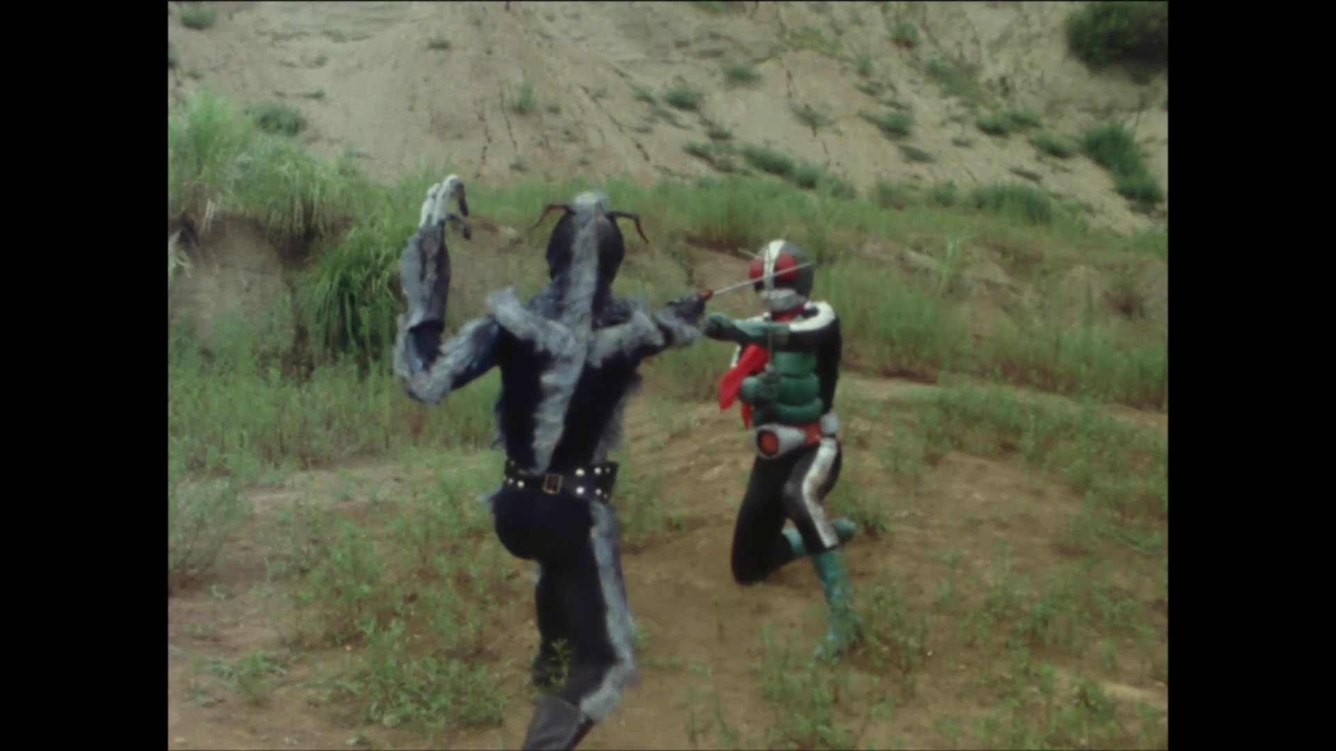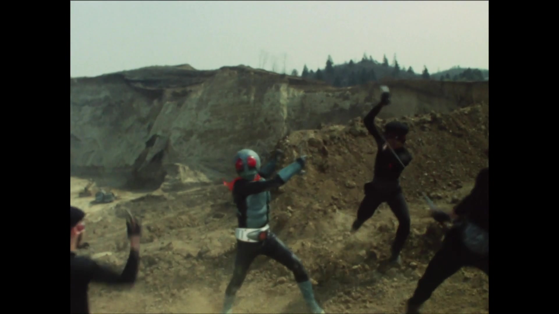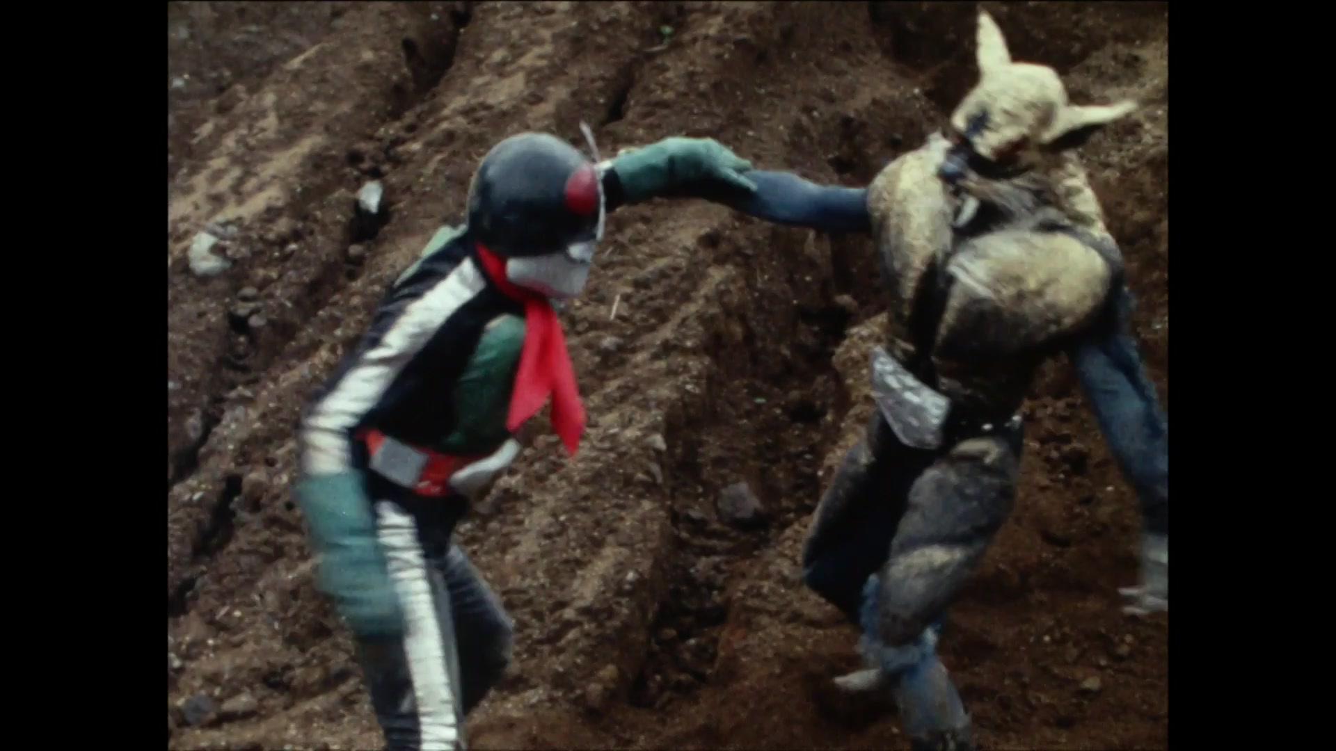 Masked Rider, having fallen into a pit trap, loses his power in the secret room where no wind can reach and reverts back to his form as Hongo.