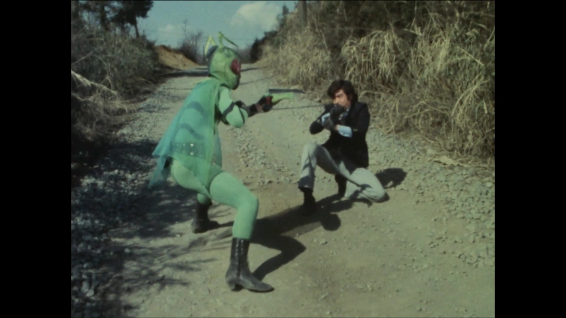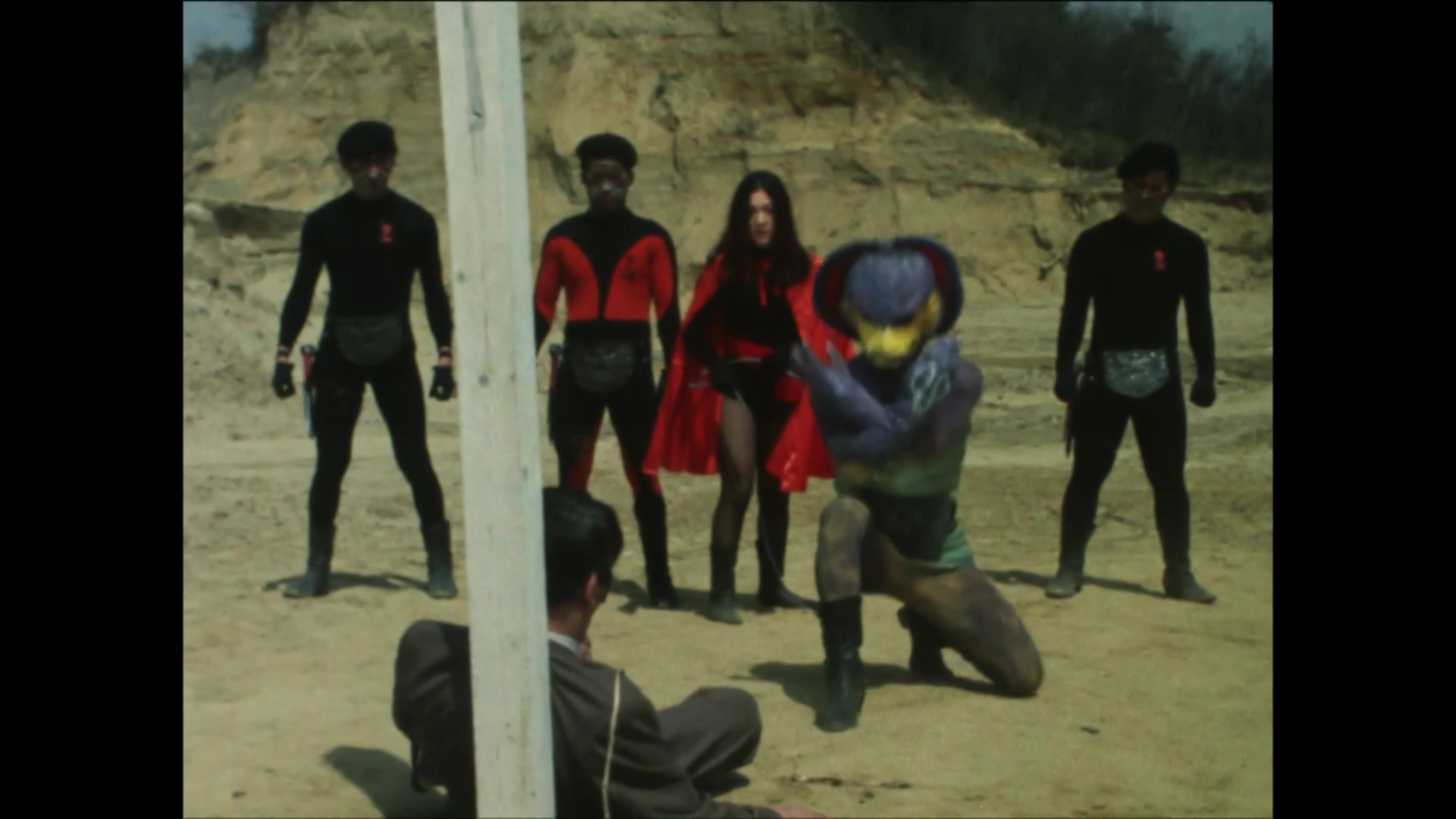 Gel-Shocker's Scorpiolizard uses the Shocker scientists as the guinea pigs for an oxygen deprivation gas and eliminates them. However, one scientist, Takashi, does escape. Scorpiolizard pursues Takashi and attacks his wife's hospital.