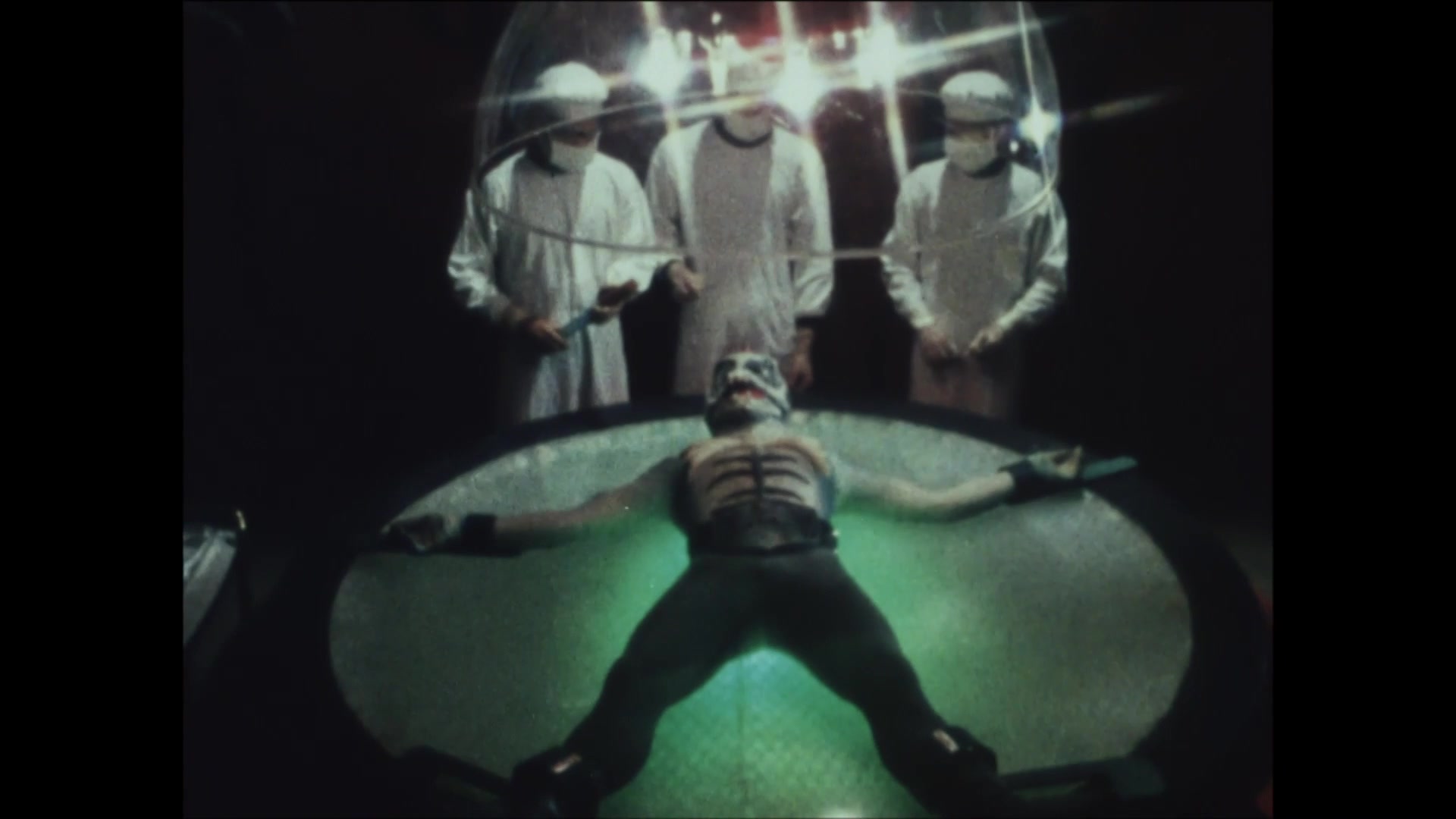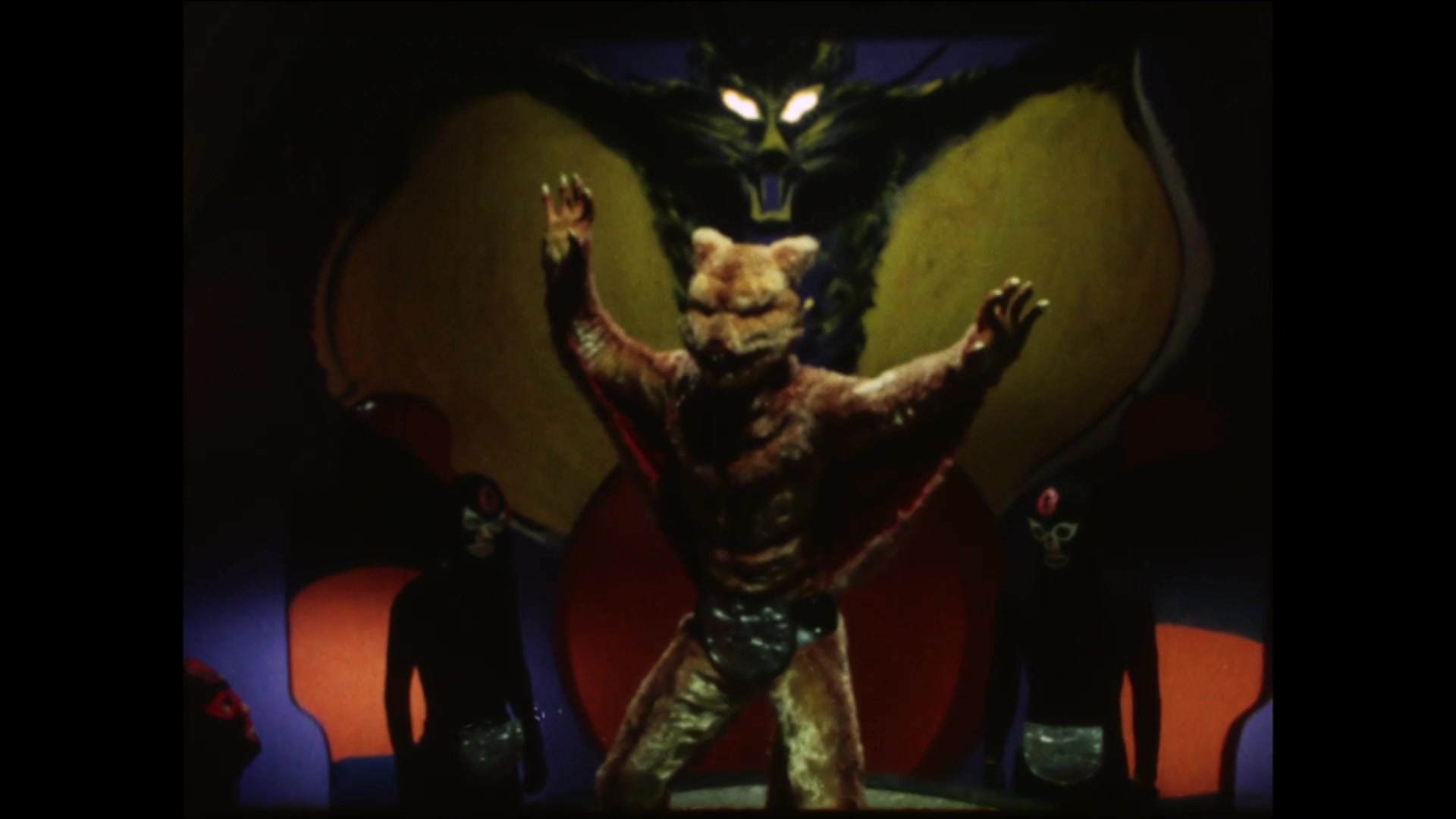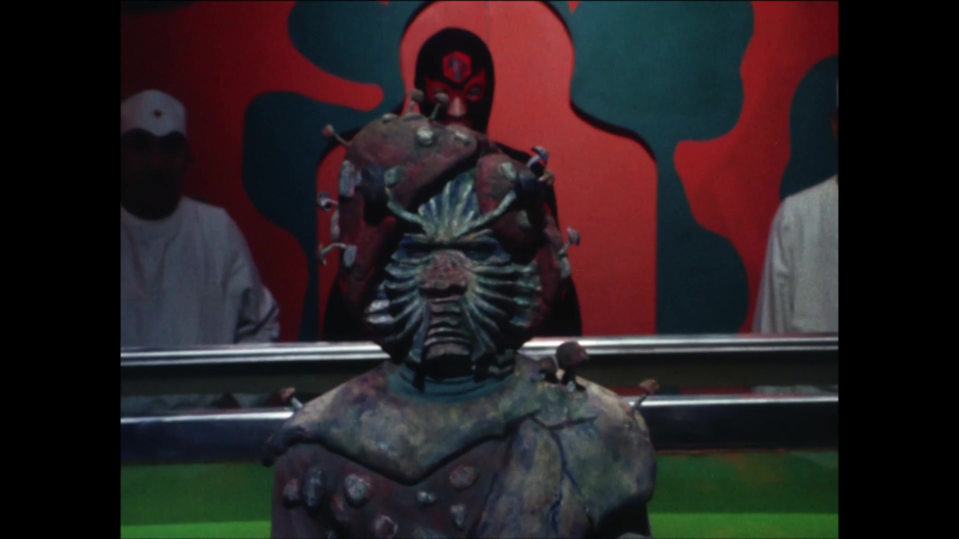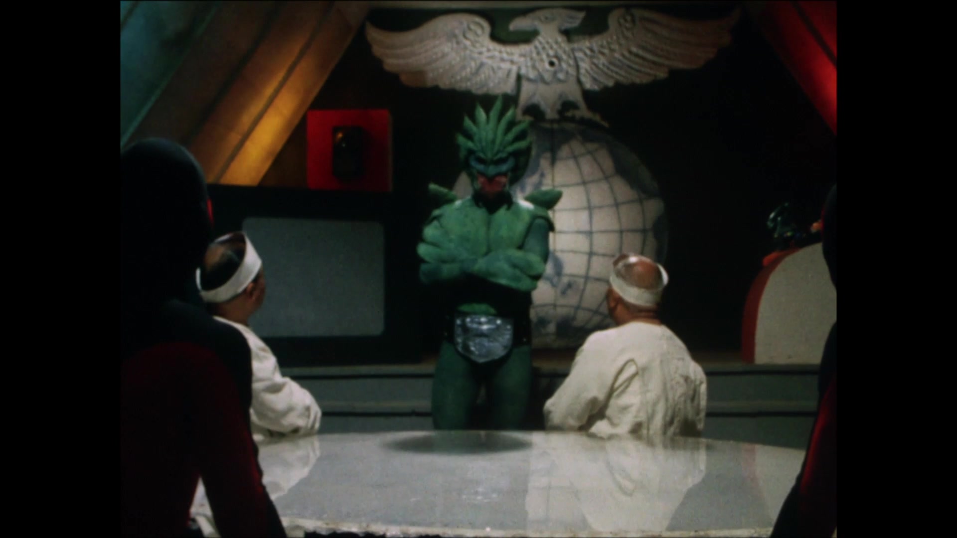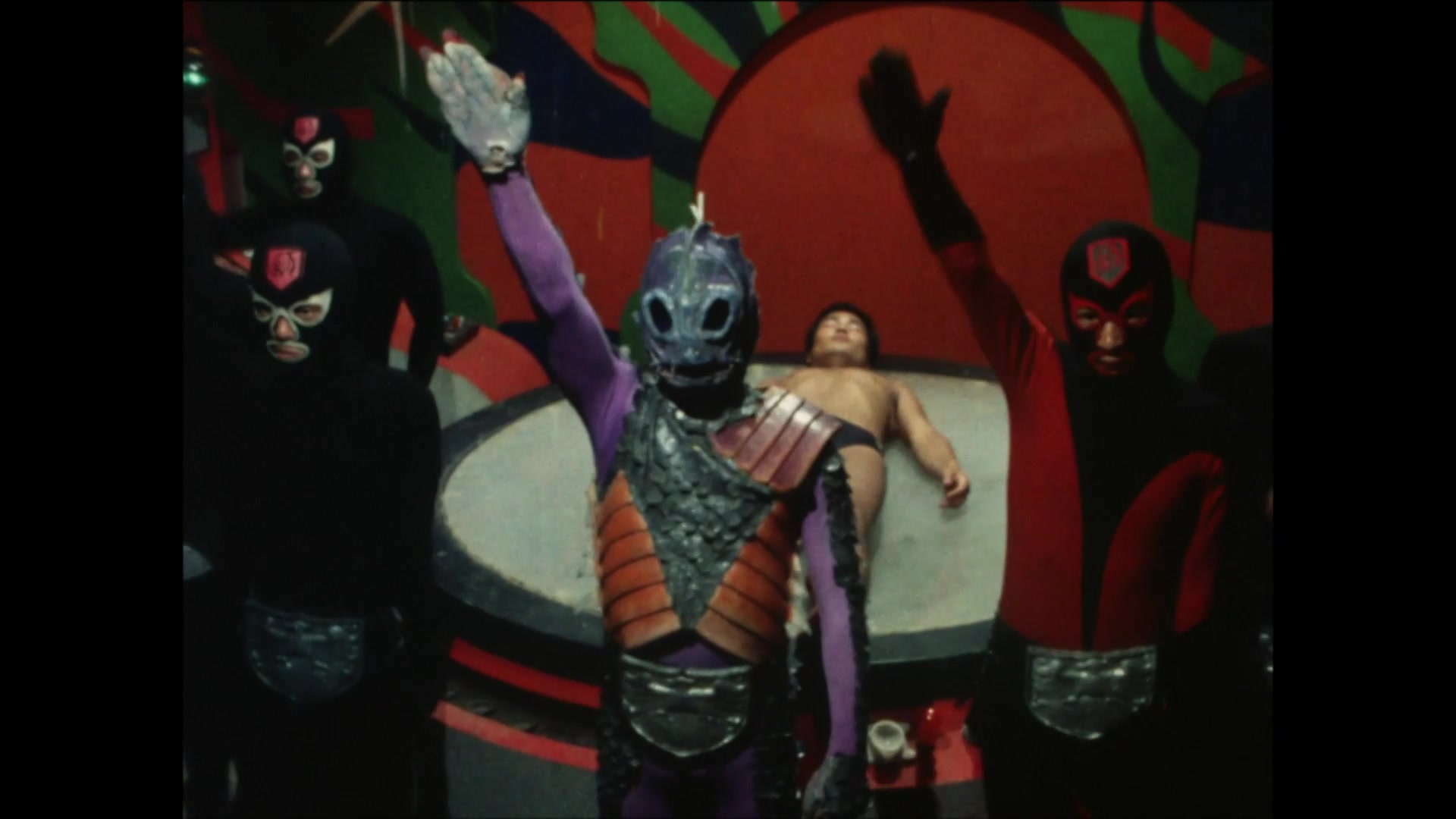 Pirazaurus experiments with the powerful deadly gas, “Mist of Death,” at a gogo house. He launches his scheme to obliterate Japanese leaders with the Mist of Death as they spectate a pro wrestling match.