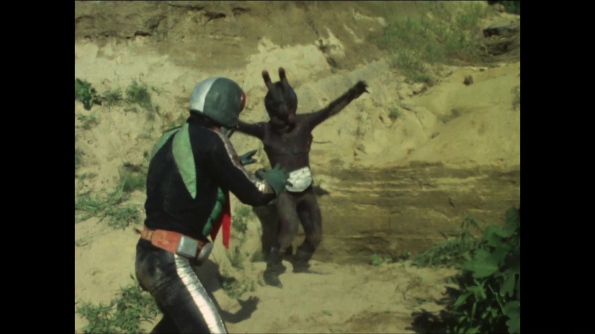Masked Rider #1 is driven back by the Shocker Rider and the monster Haetoribachi's coordination and sinks under the sea with Haetoribachi.