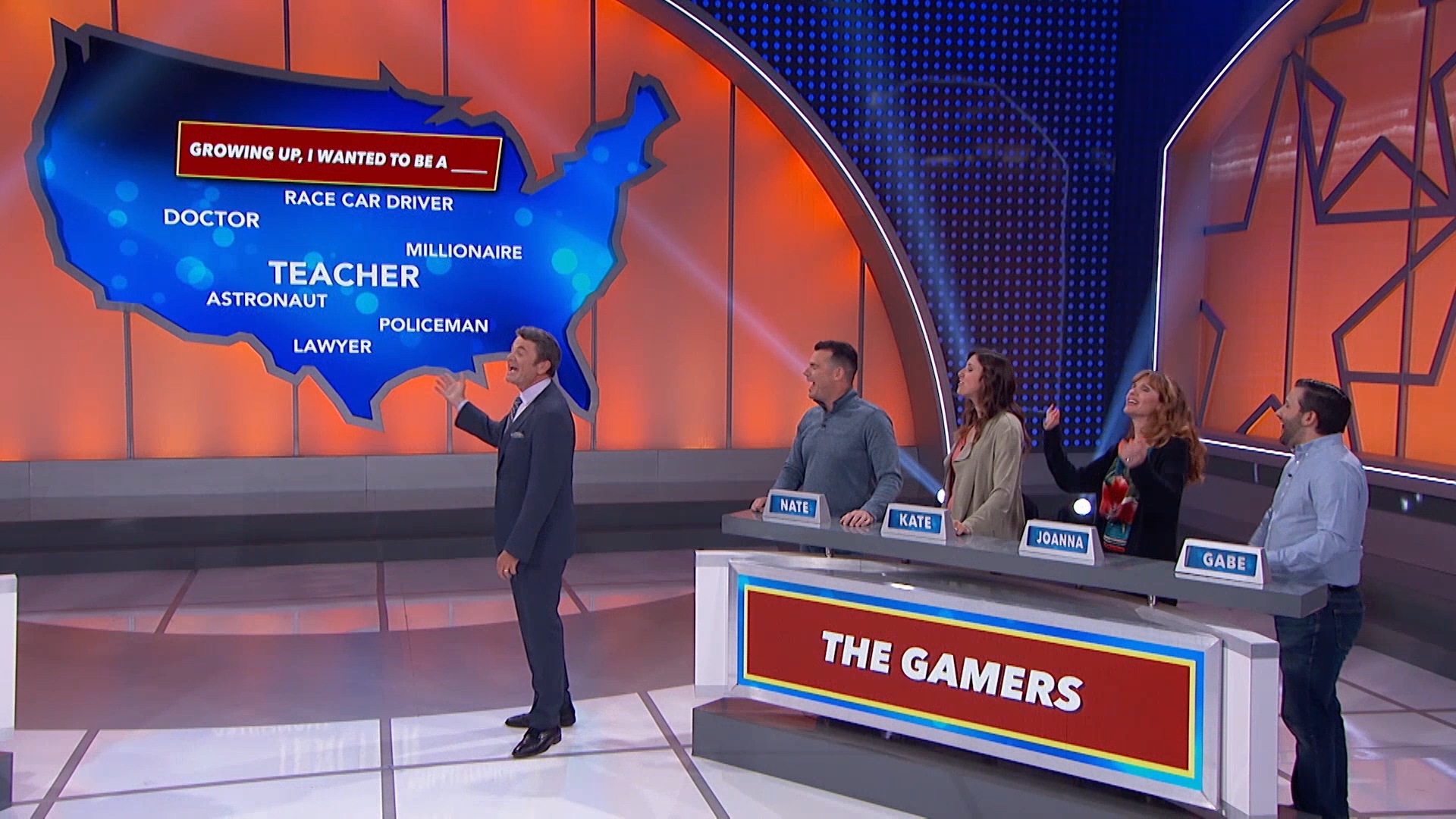 Two teams of friends and family race against a clock to guess how America filled in the blanks on a series of survey questions covering every topic under the sun. John Michael Higgins hosts.