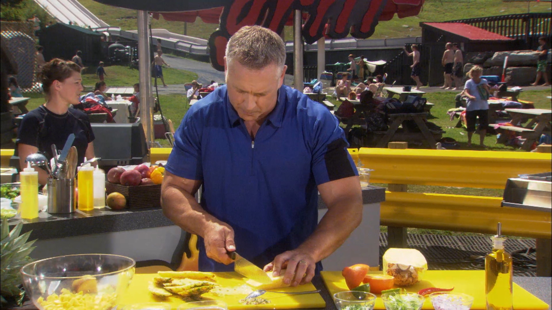 Matt y el equipo de Road Grill pasan el día jugando en el parque acuático. El pollo asado con mantequilla de lima-limón asado, los pinchos de pez espada a la parrilla con salsa caribeña y las chuletas de cerdo son las estrellas.