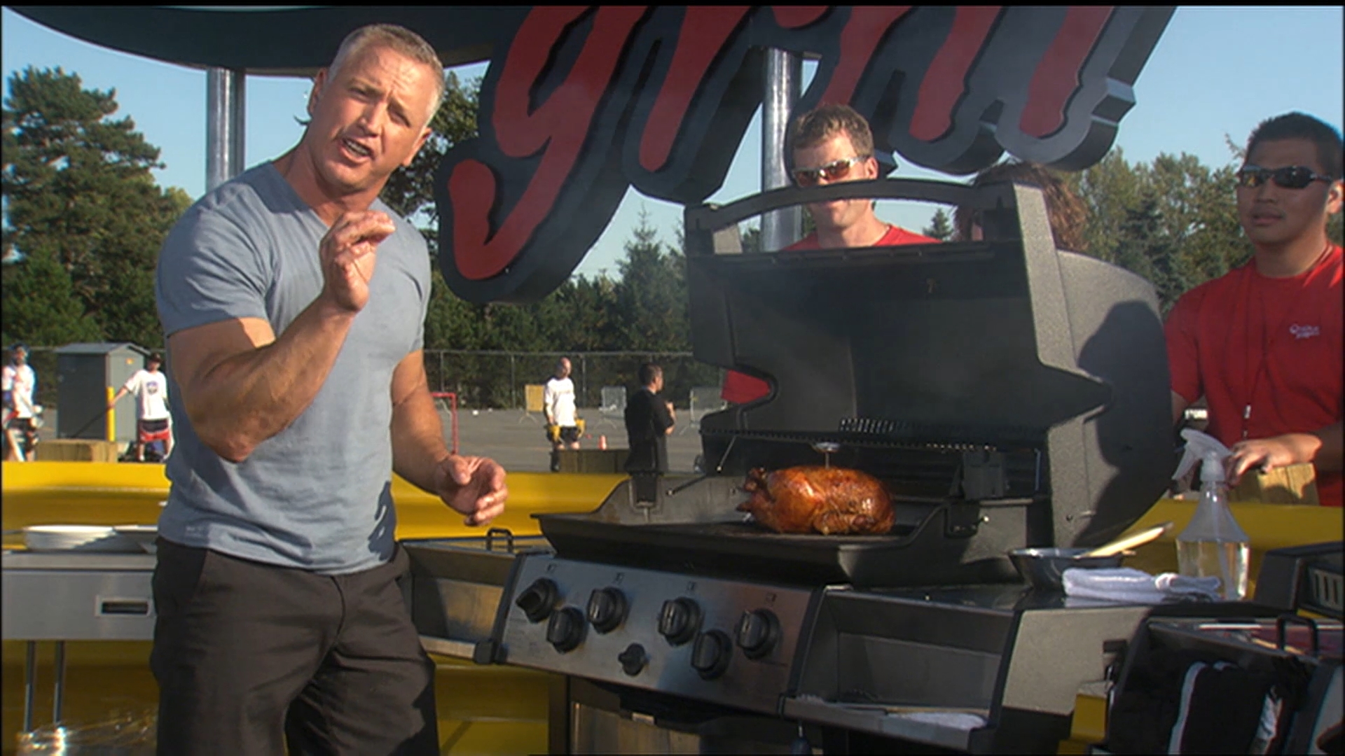 Matt, Karrie, Jenna y Charlotte son el equipo Road Grill en un torneo de hockey de pelota para recaudar fondos. Le imprimen emoción y sirven a los jugadores chuletas de cordero a la parrilla.