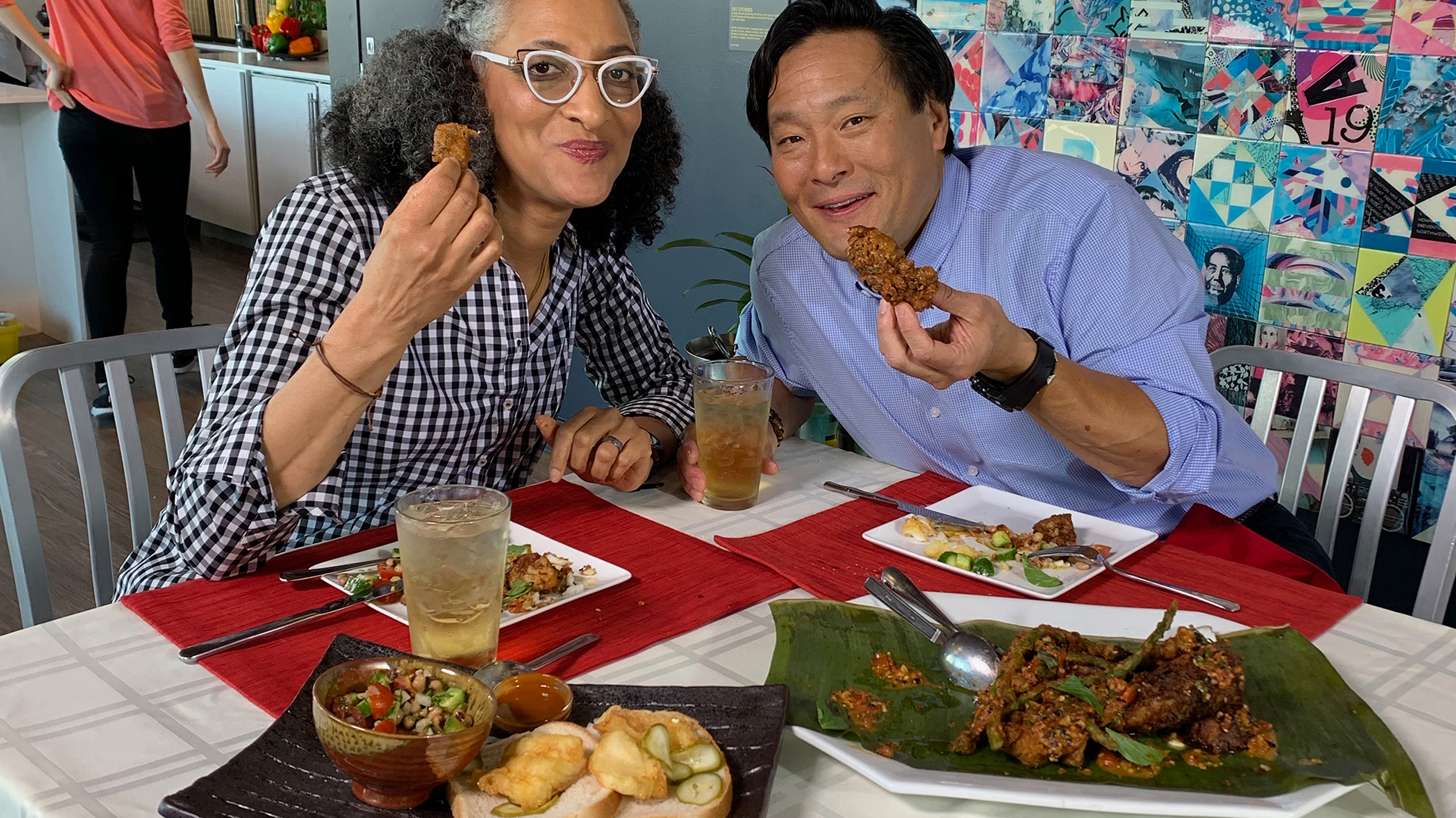 Chef Carla Hall cooks up a childhood favorite: Fried Fish Southern Style with Black-Eyed Pea Salad and a Hot Sauce Vinaigrette. Ming counters with Thai Bird Chile Tempura Fish with Maitakes and a Black Bean-Thai Basil Sauce.