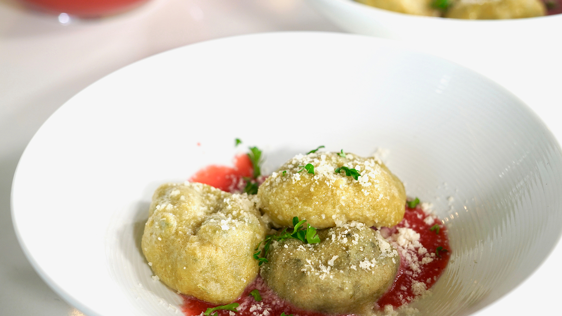 Chef Alex Crabb makes Dandelion Gnudi--gnocchi-like dumplings made with rich ricotta cheese. Ming follows with vegetarian raviolis stuffed with a flavorful plant-based meat substitute, topped with Thai Coconut Sauce.
