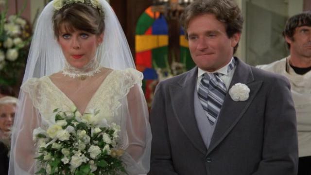 Mindy is the beautiful bride and Mork is the outrageously funny groom - who may not be able to fit into his tuxedo if he can't convince Orson to approve the marriage and undo his transformation of Mork into an English sheep dog.