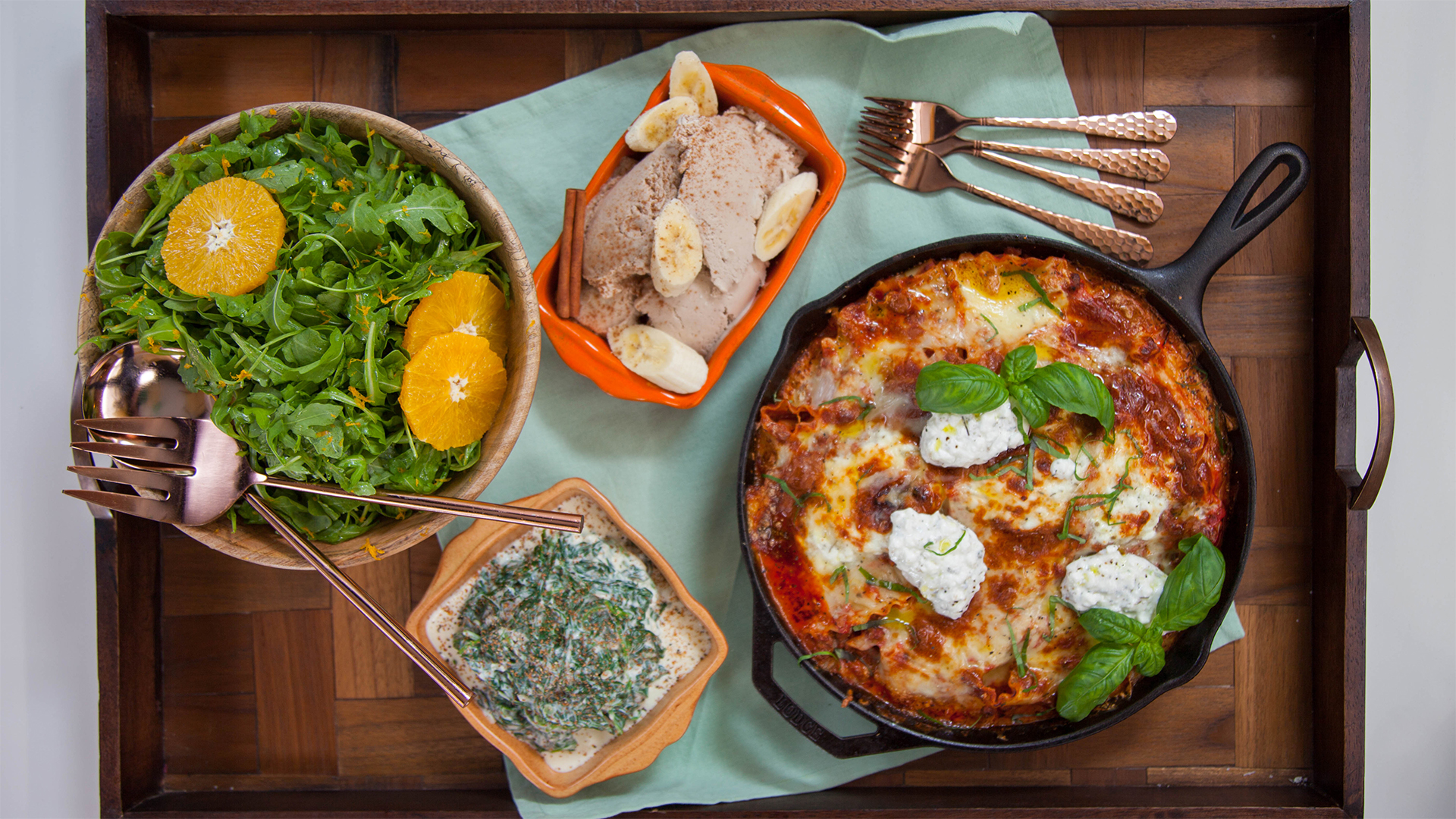 El chef Spencer Watts prepara platos deliciosos, rápidos y sencillos como lasaña al sartén, espinacas a la crema y helado de banana. Todo en menos de 30 minutos.