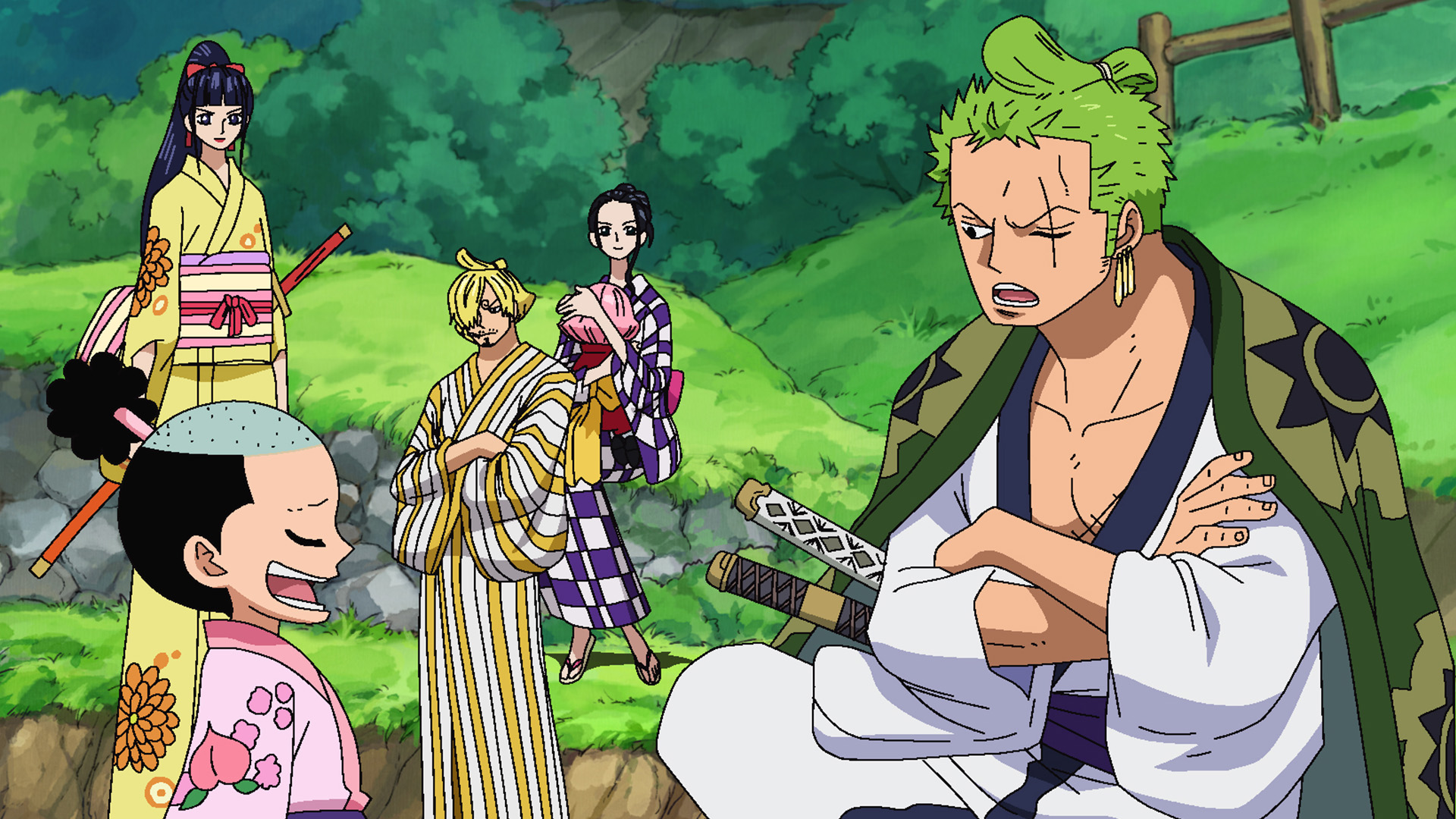 Kin'emon, Momonosuke, and the others can't fight back tears when they hear that Hiyori is alive. Zoro is stunned by Enma's demonic power and its ties to him.