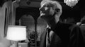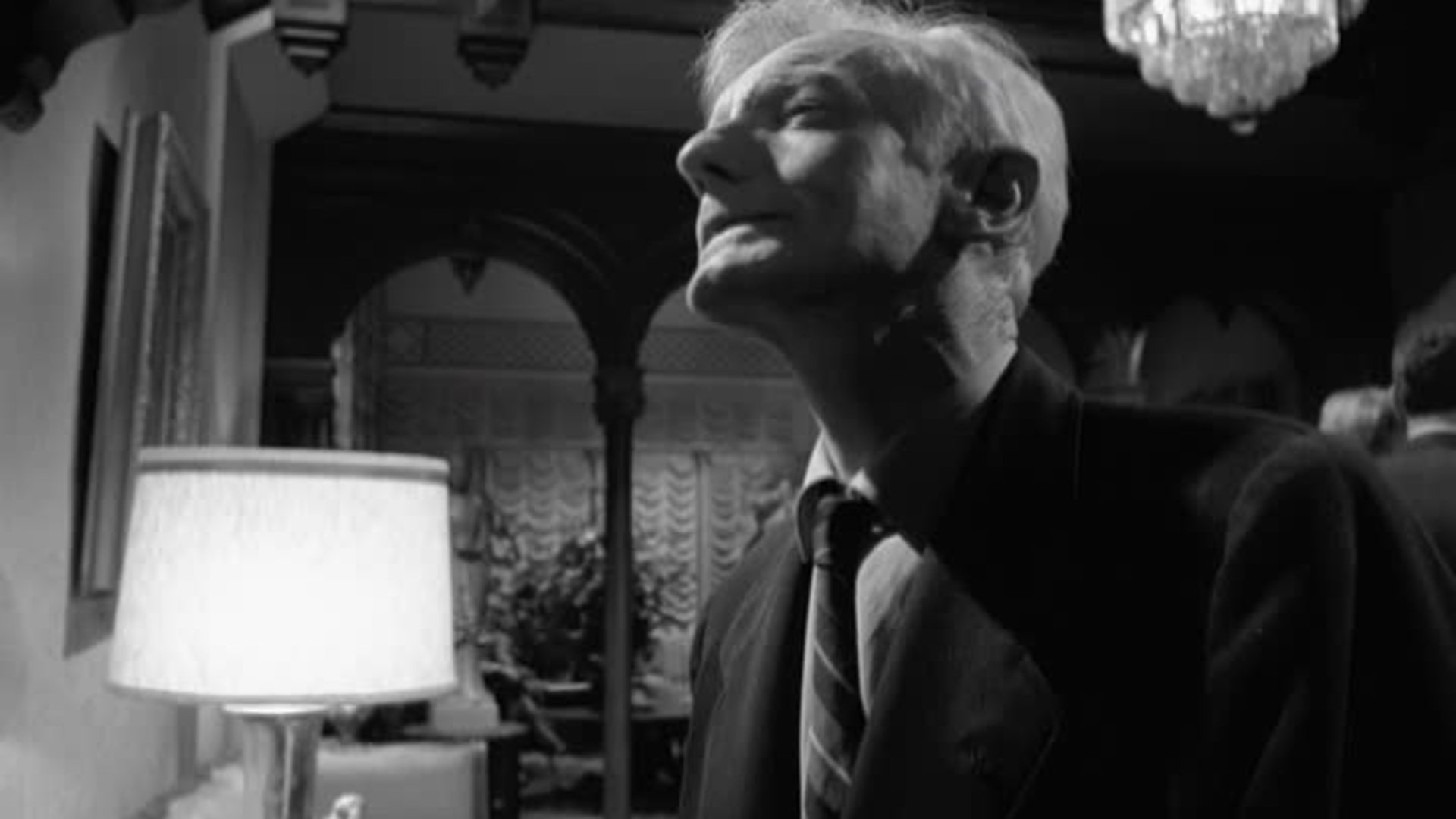 A man calmly enters a nightclub, takes off his scarf, and with it, strangles an older woman.