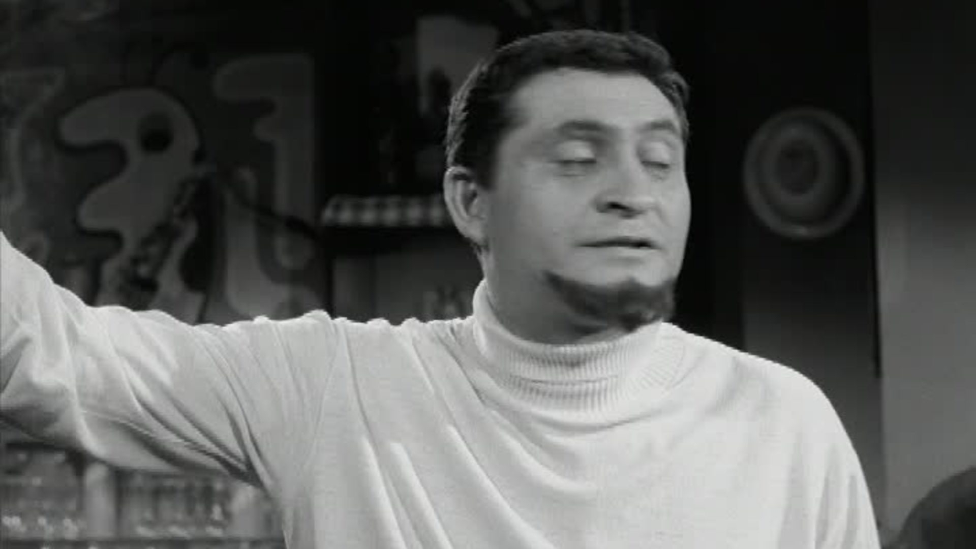 A mobster, the Frog, is stabbed on a dock and falls into a river, his green hat floating above him. The Frog was waiting to meet Peter Gunn, who is jumped when he goes to the Frog's apartment.