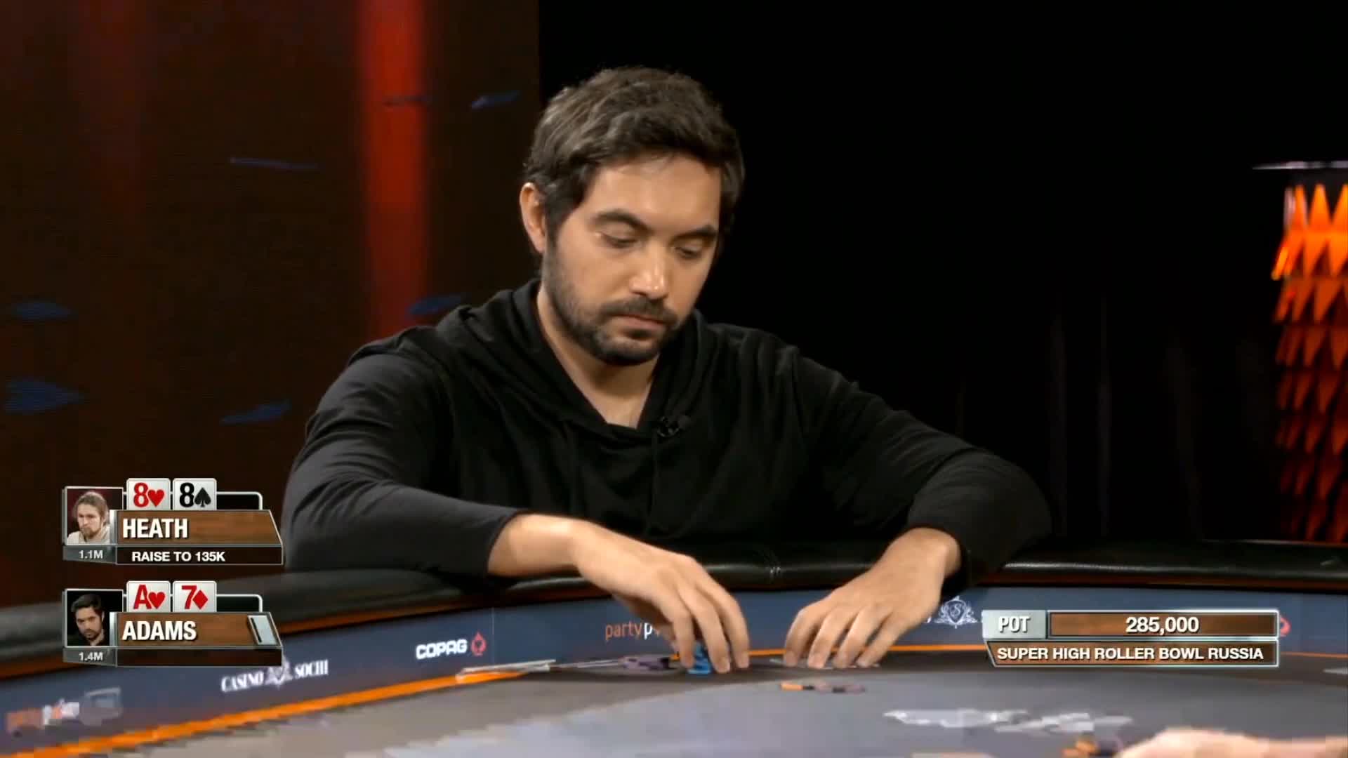 The Super High Roller Bowl Russia final table is set at the Sochi Casino. Benjamin Heath is the chip leader ahead of Adrian Mateos, Christoph Vogelsang, Timothy Adams, Mikita Badziakouski, Ivan Leow, and Stephen Chidwick. All eyes are on the $3.6 million.