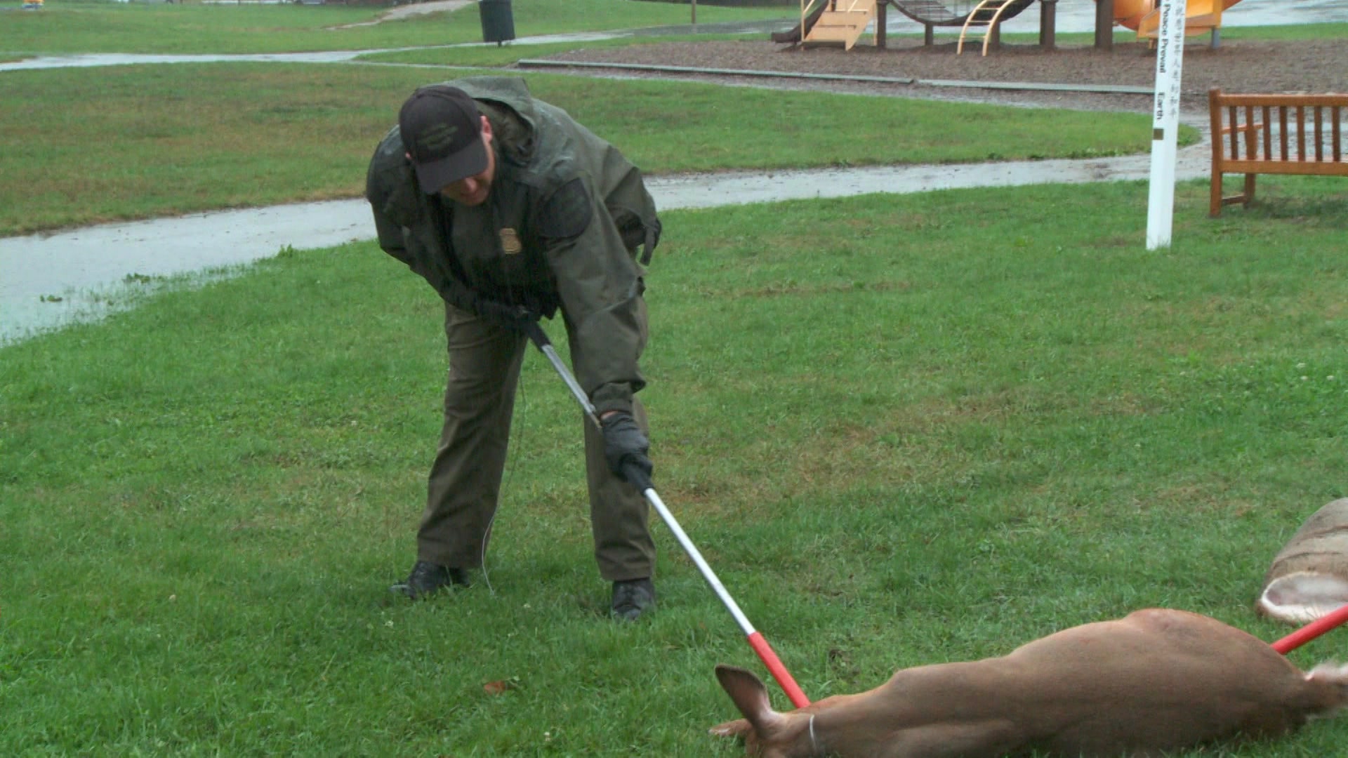 Michigan Conservation Officers patrol during the opening days of deer season for hunting with both archery equipent and firearms. A CO helps remove two deer from an elementary school after they crashed through a window in the middle of the night.