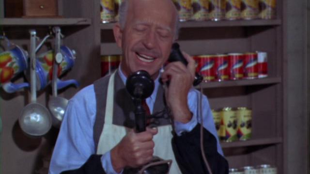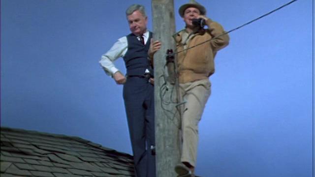 After some wheeling and dealing and mending a rift between Mr. Kimball and his mother, Oliver (Eddie Albert) finally has a phone installed, but the Hooterville Phone Company installs it directly outside his bedroom window...on top of the phone pole.