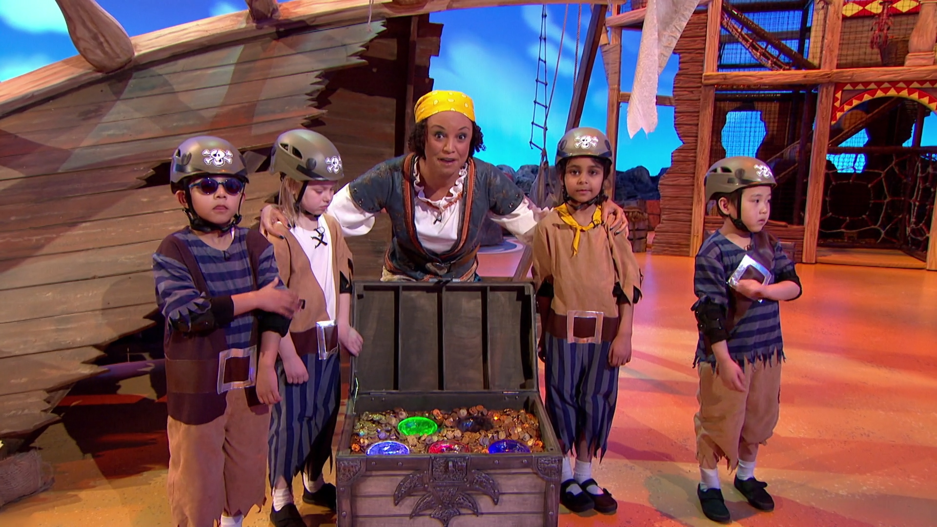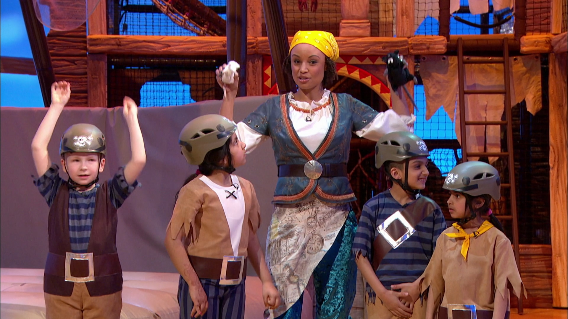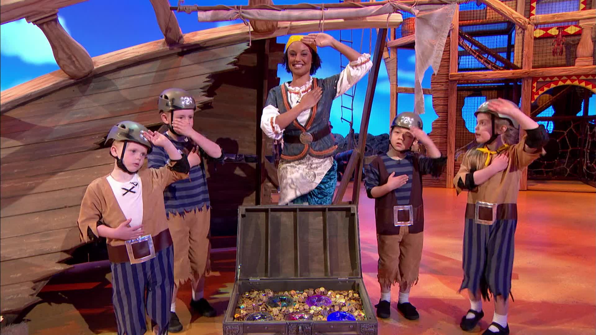 The Swashbucklers are a team of 5-7yr old pirates who undertake a number of physical team games, guided by Gem, to win the jewels - with the naughty Pirates trying to put them off.