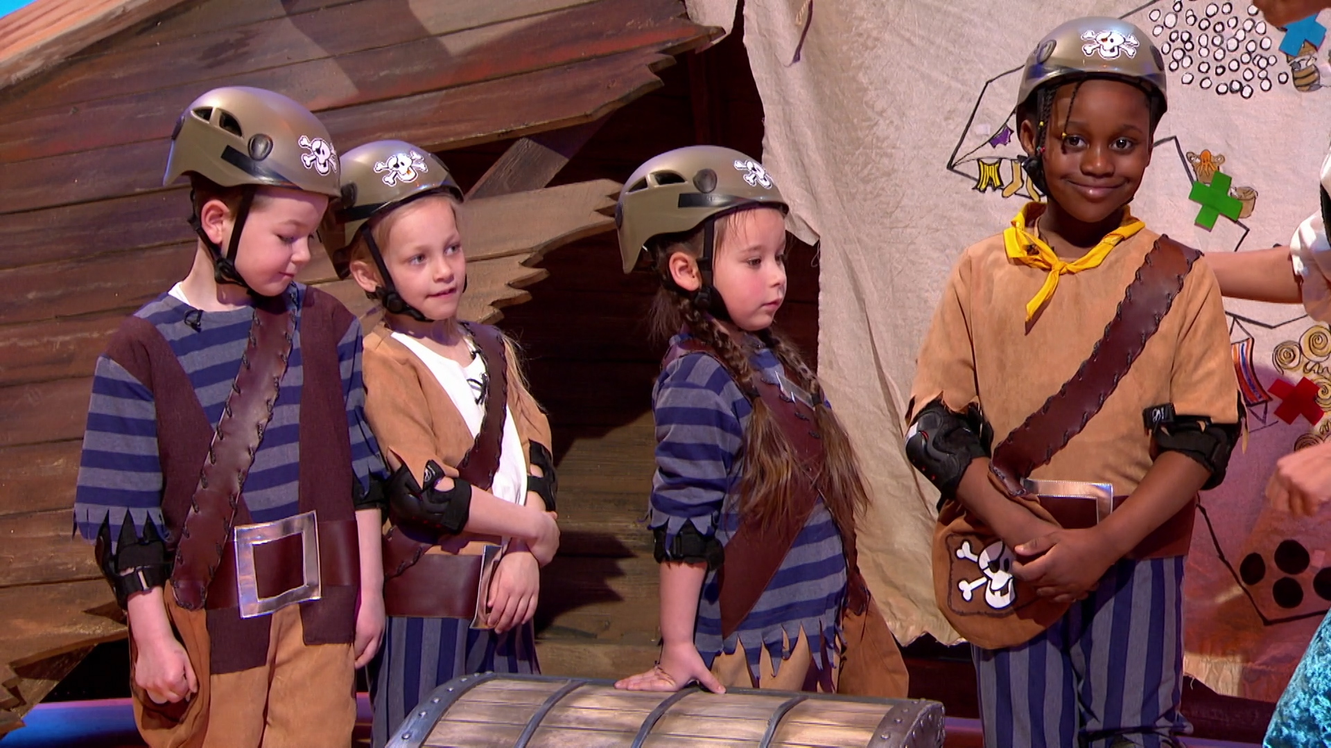 The daring young swashbucklers take on the Stepping Stones and Tumbly Barrel games.