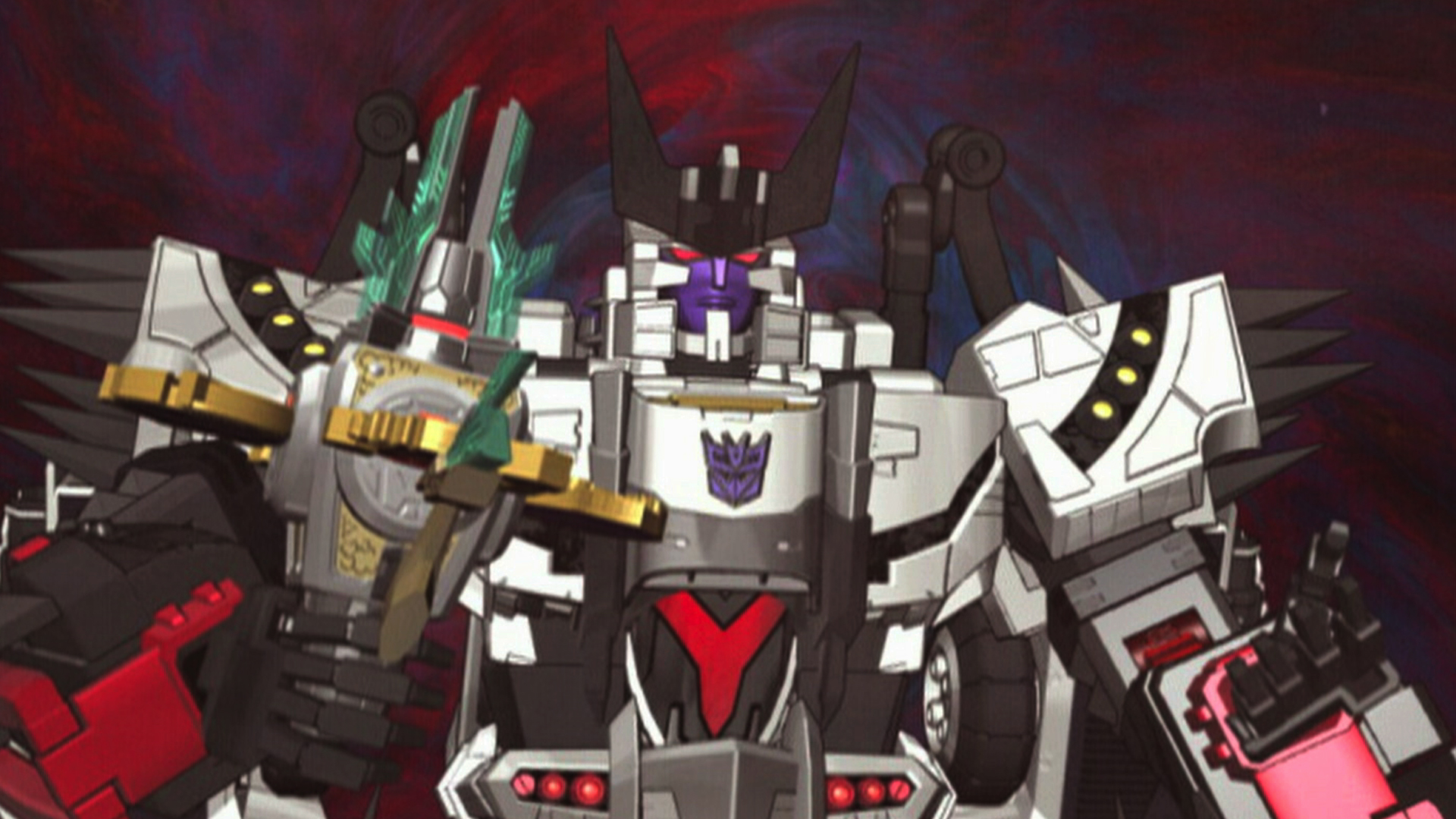 Optimus approaches Galvatron to take the Omega Lock and Planet Keys. However, Galvatron is drawing out the power of the Planet Keys, and Thundercracker, Thunderblast, Ransack, and Crumplezone grow to giant size.
