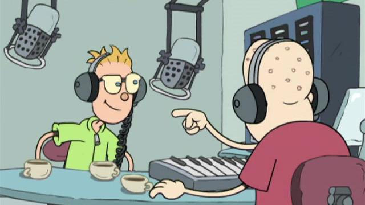 Ian y Dennis convierten los Anuncios Matutinos de la escuela en un programa de Radio Matutino.